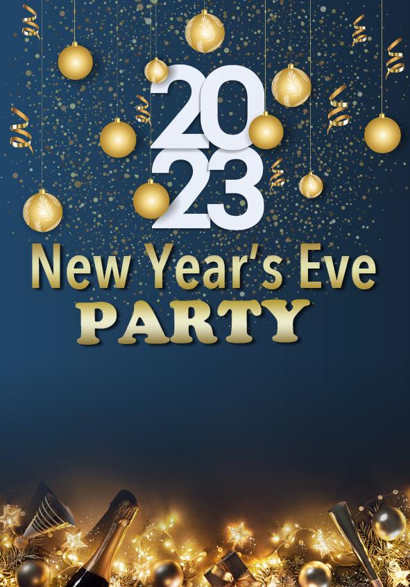 Doors Open • 5 pm (for ticket holders) Hors d’oeuvre Buffet • 7 - 9 pm | Breakfast Buffet • Midnight - 1 am $30 • Club members | $35 • Nonmembers ADULTS ONLY Saturday, 31 December 7 pm - 1 am • Weekender Lounge Celebrate the New Year with the Officers’ Club! Join us for this special combination ticket of NYE hors d’oeuvres and have your first breakfast of 2023! There will be food, party favors, entertainment, and a champagne toast. Tickets on sale starting Thursday, 1 December. Open to adult officer ranks and civilian equivalents only.