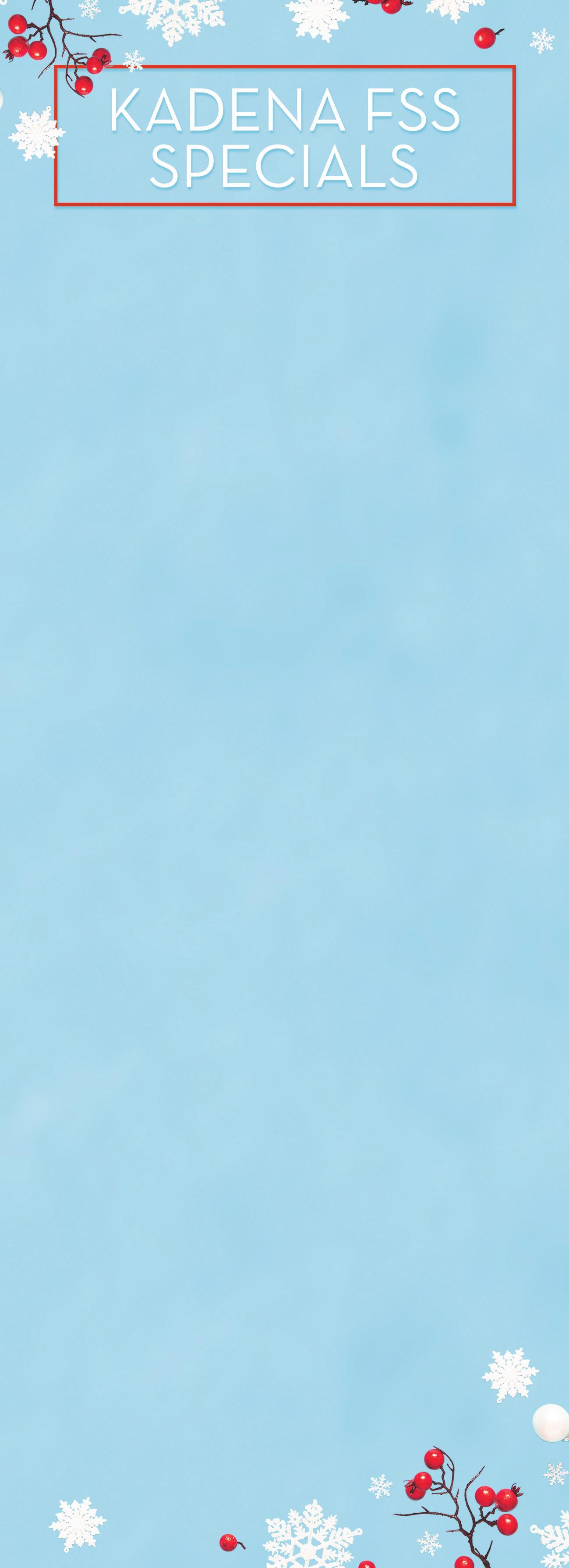 Dinner includes: • 32 oz Stuffing • 32 oz Green Beans • 32 oz Turkey Gravy or Pineapple Raisin Sauce • 32 oz Mashed Potatoes • 16 oz Cranberry Sauce • A dozen Dinner Rolls • One Pumpkin Pie Additional sides available for purchase: • Cranberry Sauce • Dinner Rolls • Herb Stuffing • Mashed Potatoes • Green Beans • Turkey Gravy • Pumpkin Pie Payment is due at the time of order. No call-in orders will be accepted. Limited quantities are available so place your order early. Holiday DINNERS TO-GO Rocker Enlisted Club 966-7372 | Bldg 622 Enlisted Club Pre-order meal by Thursday, 22 December • Noon Pick up on Saturday, 24 December • 11 am - 5 pm $119.95 • Turkey Meal (serves 8 people) $149.95 • Large Ham Meal (serves 12 people) $99.95 • Small Ham Meal (serves 8 - 10 people) Club members receive a $5 Members First discount on package CLUBS VENTURE | KADENAFSS.COM 13