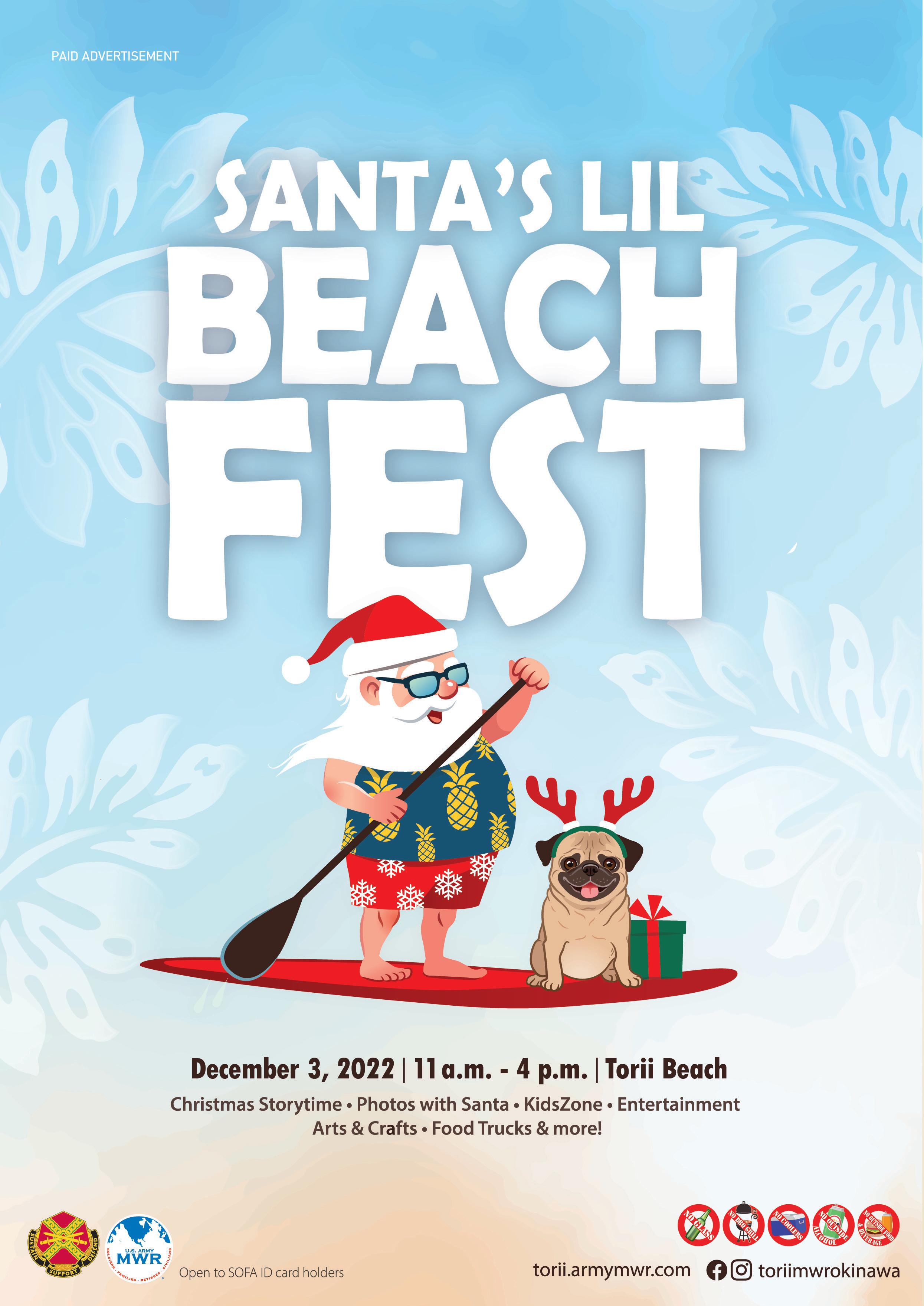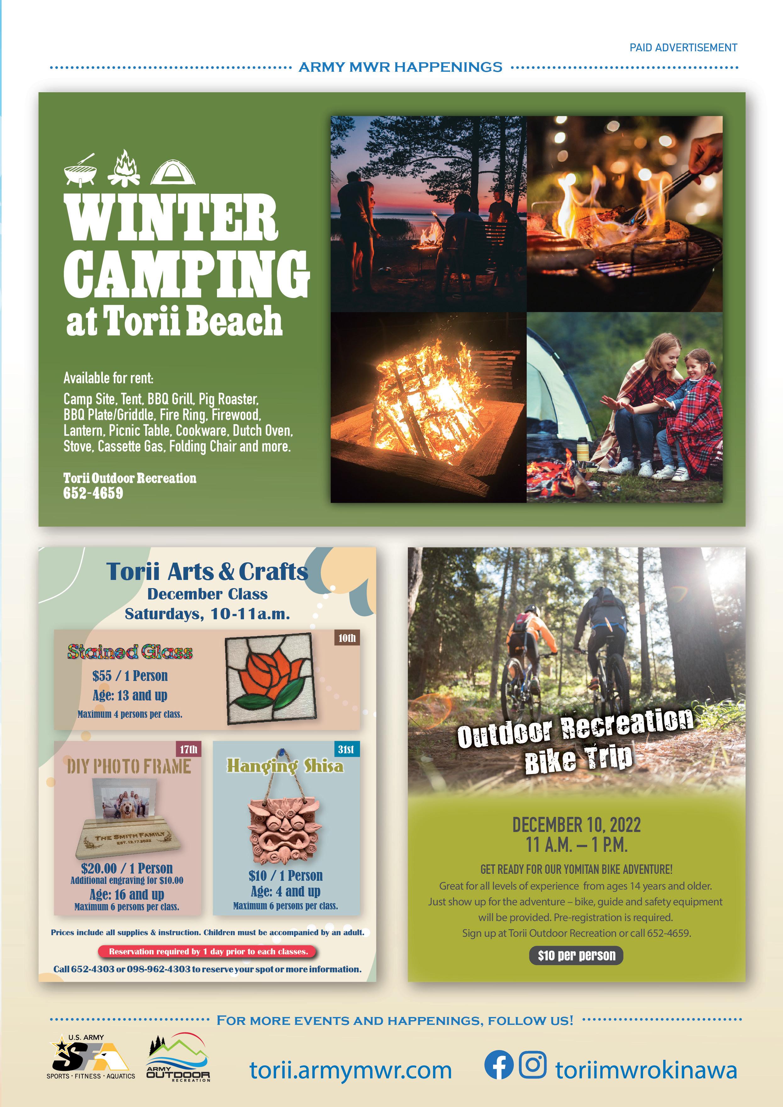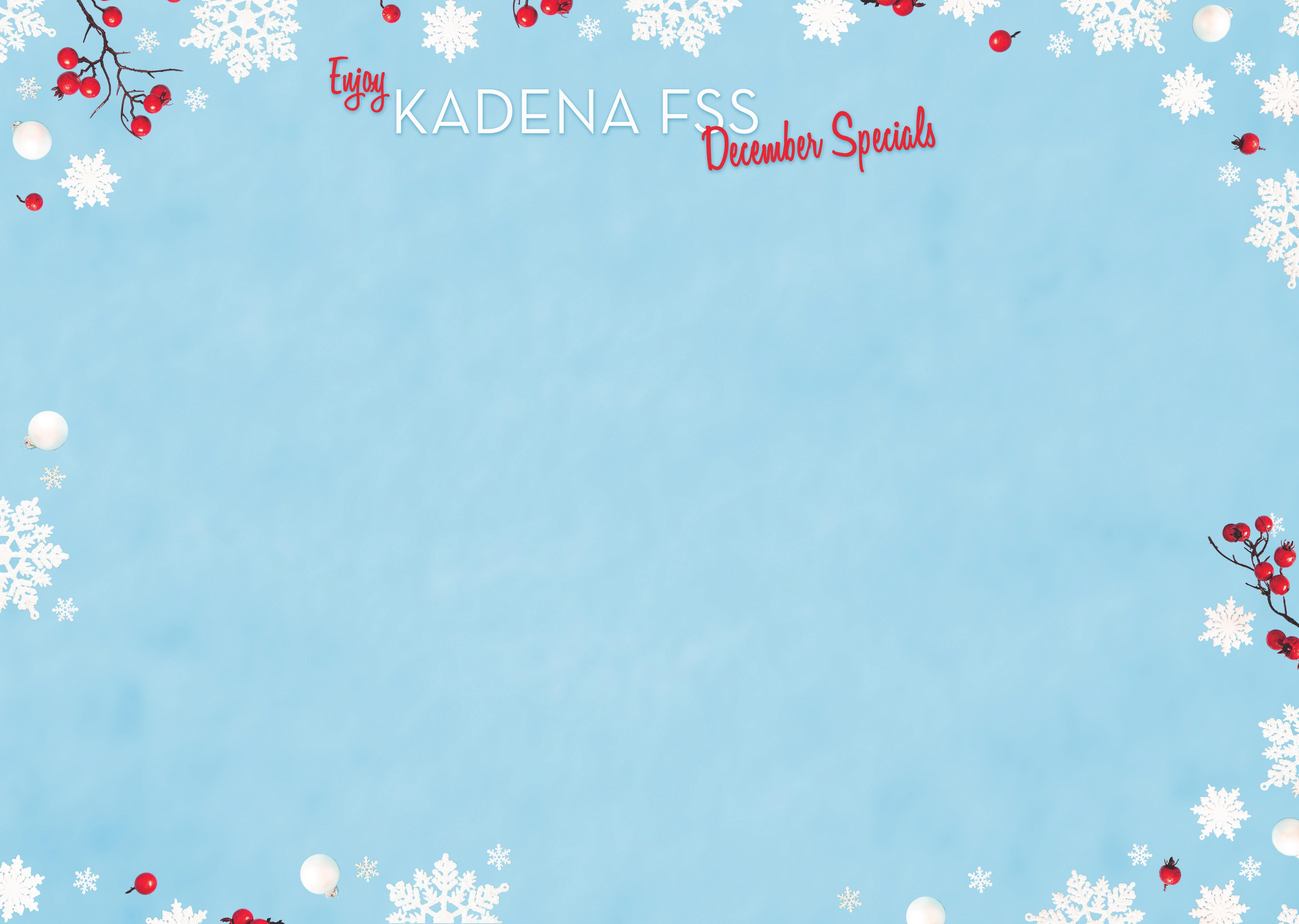 Good tidings from your friends at Kadena FSS! Carry on the jolliest tradition of the season by visiting these participating facilities for a chance to win a piece of over $1K in prizes per day! For more information, visit Kadenafss.com 5 - 16 DECEMBER 5 - 16 DECEMBER Okuma ITT Emery Lanes E Club ODR Golf Complex Shogun Auto Fitness Marina O Club Karing Kennels Arts & Crafts