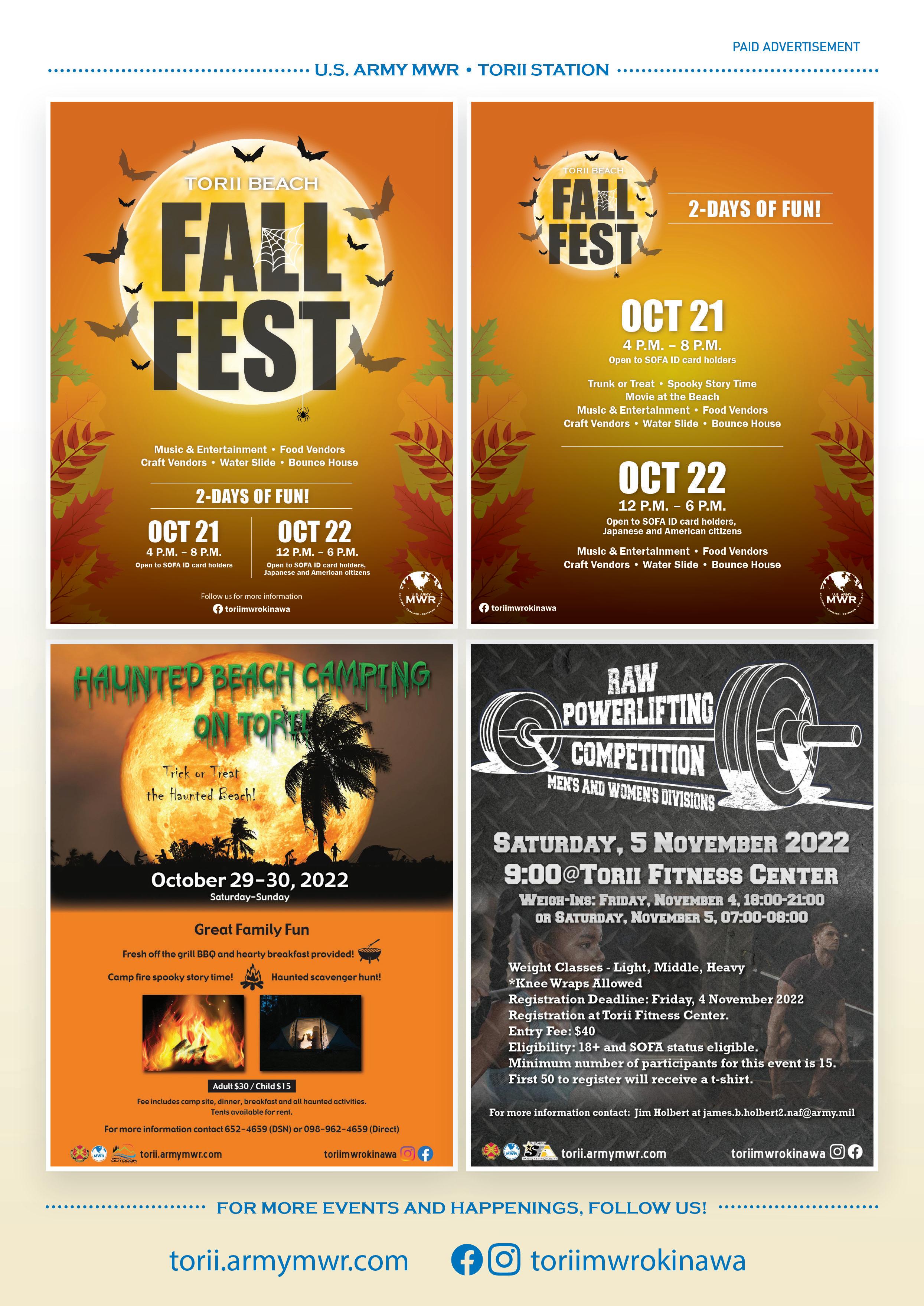 CRAFTCHELLA: Honoring the artistry of Okinawa Also check out: FSS Halloween Events AFE Presents: Battle of the Keys Dinner & Show NAF Rapid Hire Fair! OCTOBER 2022