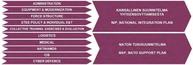 jäsenmaat yhteiseen puolustukseen siten, että maat ilmoittavat johtoportailleen puolustukseen varaamansa sotilaalliset suorituskyvyt, niiden valmius mukaan lukien. Joukkorakennetyöllä organisoidaan, hallitaan, johdetaan ja aktivoidaan Naton sotilaallinen suorituskyky vastaamaan kolmen päätehtävän vaatimuksia. Nato myös edellyttää jäsenmaiden asevoimilta suorituskykyjä. Joukkojen tulee olla taisteluvalmiita, pääosin aseistukseltaan ja suojaltaan raskaita, liittokunnan mitassa yhteensopivia, keskitettävissä tehtäviin, ylläpidossaan omavaraisia, kyvykkäitä toimimaan multi-domainoperaatioissa, sieto- ja palautumiskykyisiä, joustavia, asianmukaisesti valmiudessa sekä täysin varustettuja ja koulutettuja korkean intensiteetin taistelutehtäviin. Lista on huikean haastava ja vaatimuksia tarkennetaan, ohjataan ja valvotaan Naton toimesta.