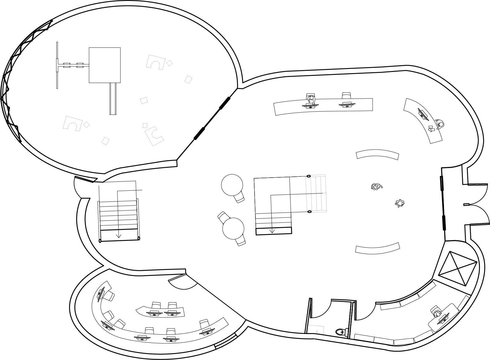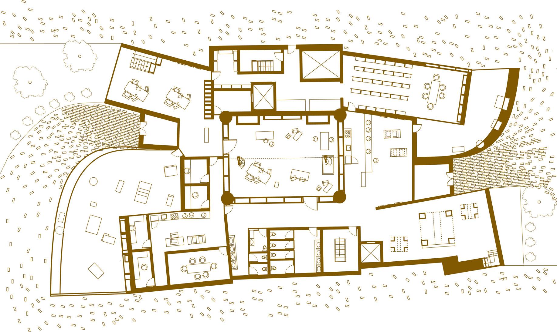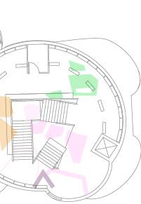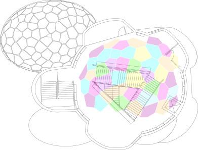The shape and language of the floor plans were designed to echo the action of turning a kaleidoscope lens, thereby revealing a colorful phenomenon from its core. The tube and building envelope hold the interior elements together, while the gem lense and envelope project geometry onto the eye piece and sensory gallery.
