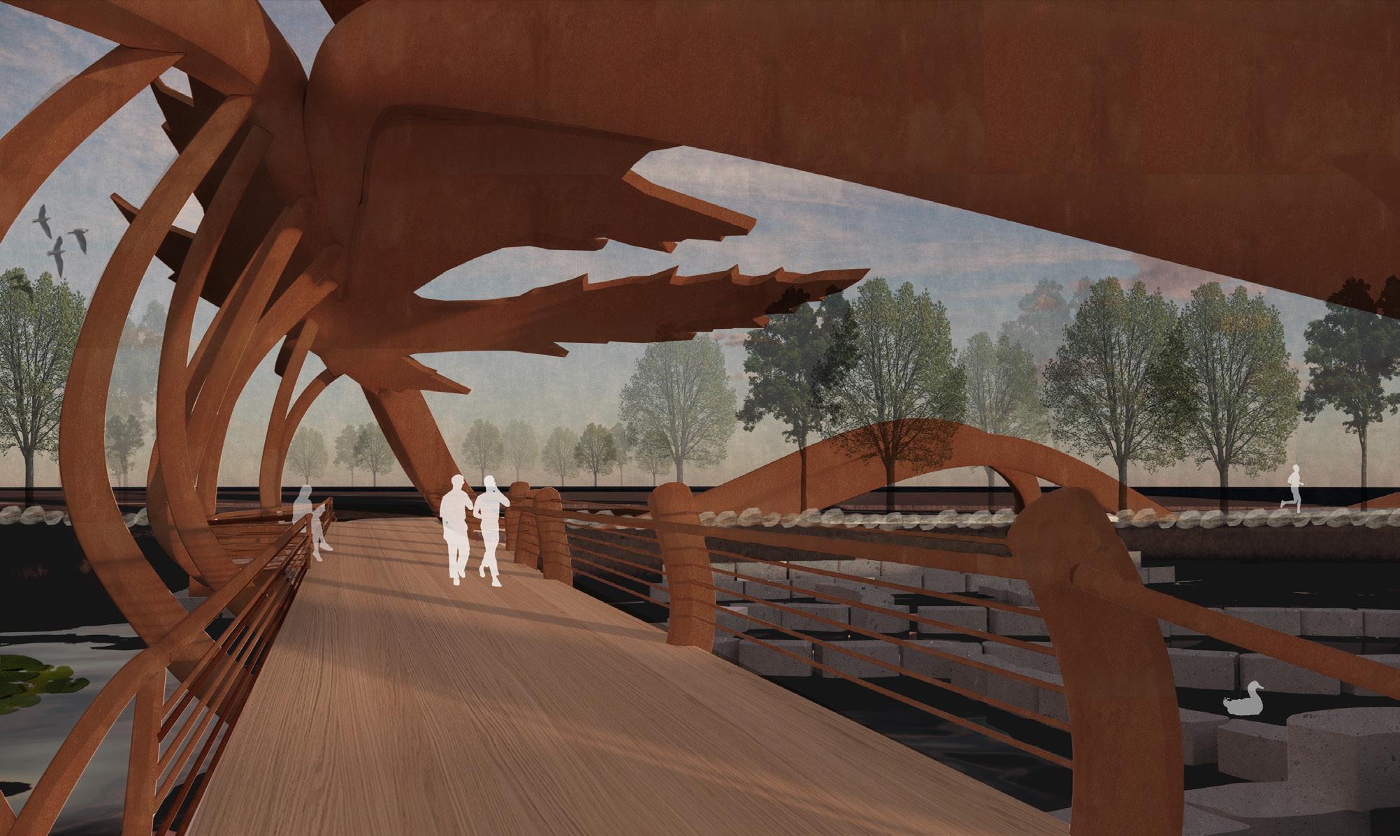 The bridge’s semblance, materiality and suspension mime the appearance and behaviour of a leaf floating atop the river. Peaceful and surrounded by scenic views, afloat provides spaces for enhanced pedestrian movement that celebrates it’s natural setting.