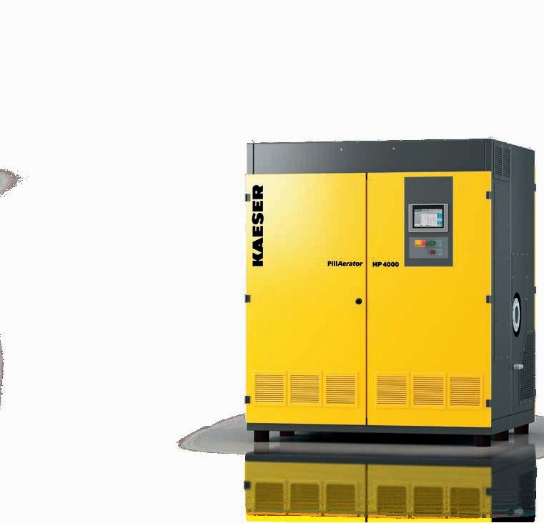 suggested three MP 6000 turbo blowers (flow rate 45,909 to 240,140 cfm, pressure 4.4 to 17.4 psi). Directly coupled, oil-free compression turbo blowers from KAESER are especially dependable and energy-efficient thanks to their high-speed motors, and stand out for their exceptional flexibility. The turbo impeller and motor shaft start, stop and rotate by means of magnetic bearings, making them completely wearfree and without need of maintenance. This future-oriented turbo blower design is used for low-pressure applications with high flow rates and particular need of energy efficiency and process air availability. To achieve especially high efficiency, machines feature