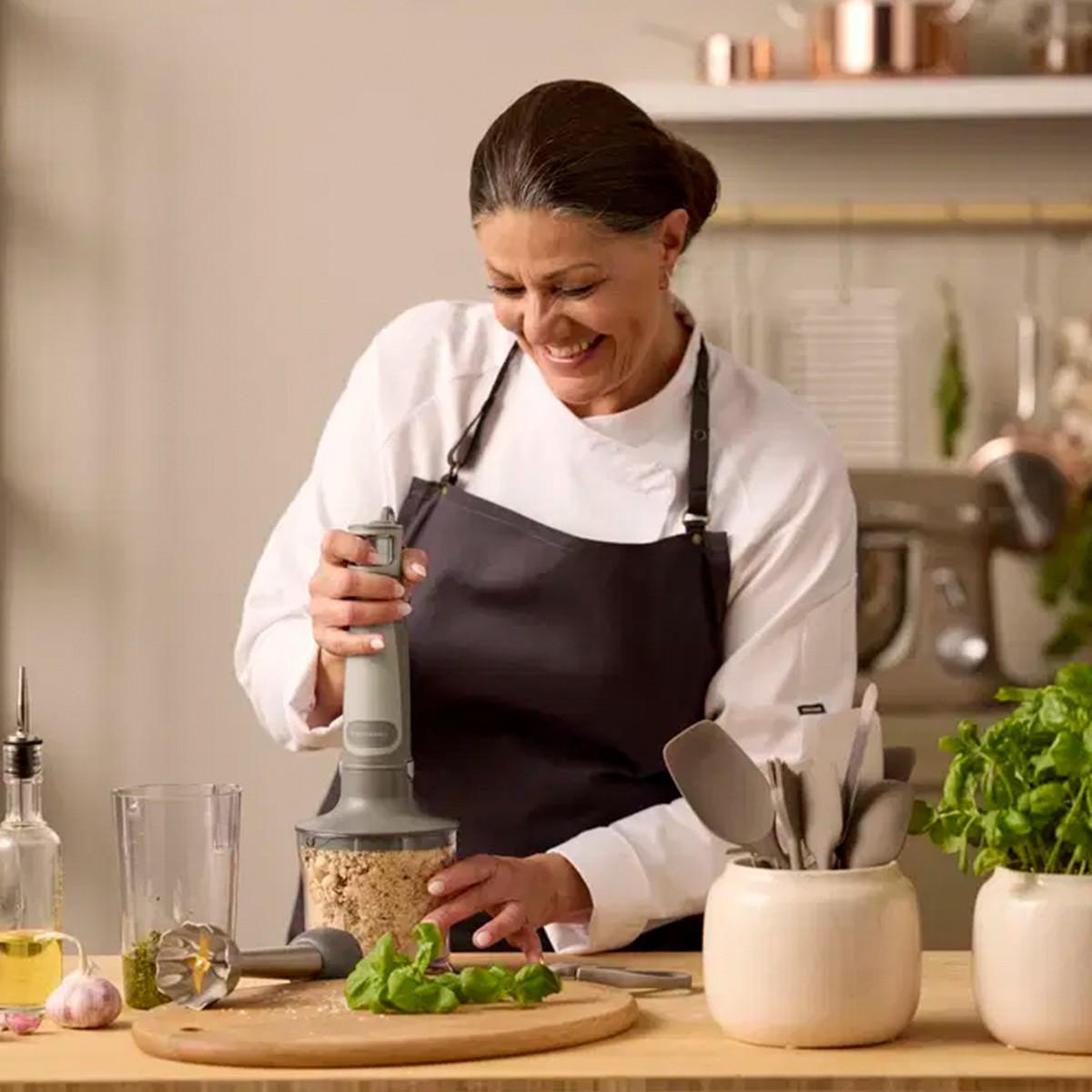 Sættet indeholder en 500 ml minihakker, der hurtigt klarer nødder, krydderurter og grøntsager samt et 600 ml målebæger, som er perfekt til at måle ingredienser eller blande mindre portioner direkte i bægeret.