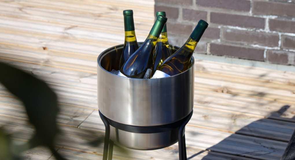 SACKit Pa}o Accessory Stand is an indoor/outdoor stand in powder-coated stainless steel that is created in a simple design and func}ons as a natural extension of SACKit Wine Bucket, which is an elegant wine cooler and ice bucket that can be used both inside and outside. The wine bucket has a two-layer construc}on, which will keep your wine cold for the whole evening.