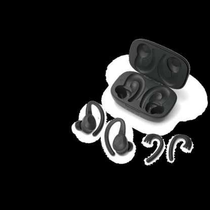 Ac}ve is the ul}mate headset for sports - even swimming. The ear hooks give the earbuds an extremely secure otperfect for working out. You can use the earbuds without the ear hooks as well 3 perfect for nights or at work. The headset charges when in the case. The case has LED indicators that show you how much power you have lev.