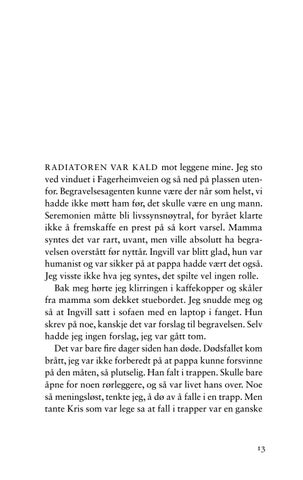 ved vinduet i Fagerheimveien og så ned på plassen utenfor. Begravelsesagenten kunne være der når som helst, vi hadde ikke møtt ham før, det skulle være en ung mann. Seremonien måtte bli livssynsnøytral, for byrået klarte ikke å fremskaffe en prest på så kort varsel. Mamma syntes det var rart, uvant, men ville absolutt ha begravelsen overstått før nyttår. Ingvill var blitt glad, hun var humanist og var sikker på at pappa hadde vært det også. Jeg visste ikke hva jeg syntes, det spilte vel ingen rolle. Bak meg hørte jeg klirringen i kaffekopper og skåler fra mamma som dekket stuebordet. Jeg snudde meg og så at Ingvill satt i sofaen med en laptop i fanget. Hun skrev på noe, kanskje det var forslag til begravelsen. Selv hadde jeg ingen forslag, jeg var gått tom. Det var bare fire dager siden han døde. Dødsfallet kom brått, jeg var ikke forberedt på at pappa kunne forsvinne på den måten, så plutselig. Han falt i trappen. Skulle bare åpne for noen rørleggere, og så var livet hans over. Noe så meningsløst, tenkte jeg, å dø av å falle i en trapp. Men tante Kris som var lege sa at fall i trapper var en ganske