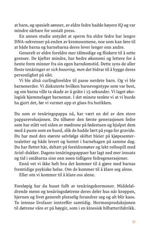 at barn, og spesielt sønner, av eldre fedre hadde høyere IQ og var mindre sårbare for sosialt press. En annen studie antydet at sperm fra eldre fedre har lengre DNA-sekvenser på enden av kromosomene, noe som kan føre til at både barna og barnebarna deres lever lenger enn andre. Generelt er eldre foreldre mer tålmodige og flinkere til å sette grenser. De kjefter mindre, har bedre økonomi og lettere for å hente frem minner fra sin egen barndomstid. Dette syns de aller fleste tenåringer er sick boooring, men det bidrar til å bygge deres personlighet på sikt. Vi ble altså curlingforeldre til passe nerdete barn. Og vi ble barnenerder. Vi diskuterte hvilken barnevogntype som var best, og om barna ville ta skade av å gråte i 15 sekunder. Vi laget økologisk hjemmelaget barnemat. I det minste tenkte vi at vi burde ha gjort det, før vi varmet opp et glass fra butikken. Du som er tenåringspappa nå, har vært en del av den store papparevolusjonen. Du tilhører den første generasjonen fedre som har stått ved siden av mødrene på fødestuen og hjulpet dem med å puste som en hund, slik de hadde lært på yoga for gravide. Du har med den største selvfølge skiftet bleier på kjøpesentertoaletter og både levert og hentet i barnehagen på samme dag. Du har flettet hår, deltatt på foreldremøter og lekt rollespill med Ariel-dukker. Dagens tenåringspappaer har lagt ned mer innsats og tid i småbarna sine enn noen tidligere fedregenerasjoner. Ennå vet vi ikke helt hva det kommer til å gjøre med barnas fremtidige psykiske helse. Om de kommer til å klare seg alene. Eller om vi kommer til å klare oss alene. Foreløpig har du huset fullt av tenåringshormoner. Middelaldrende menn og tenåringsdøtrene deres deler hus når kroppen, hjernen og livet generelt plutselig forandrer seg og alt blir kaos. To intense livsfaser inntreffer samtidig. Hormonproduksjonen til døtrene våre er på høygir, som i en kinesisk bilbatterifabrikk. 15