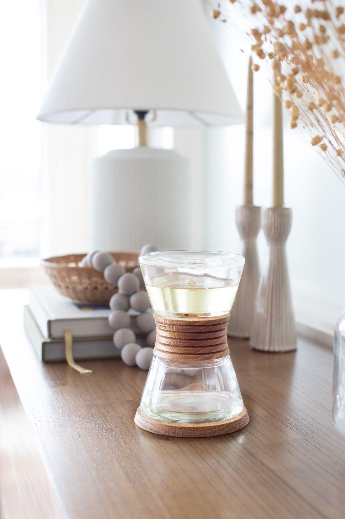 The oil drips through the wood and evaporates off it, imparting a whiff of joy. The diffuser lasts forever, with easy fragrance refills needed only every 8-12 months.