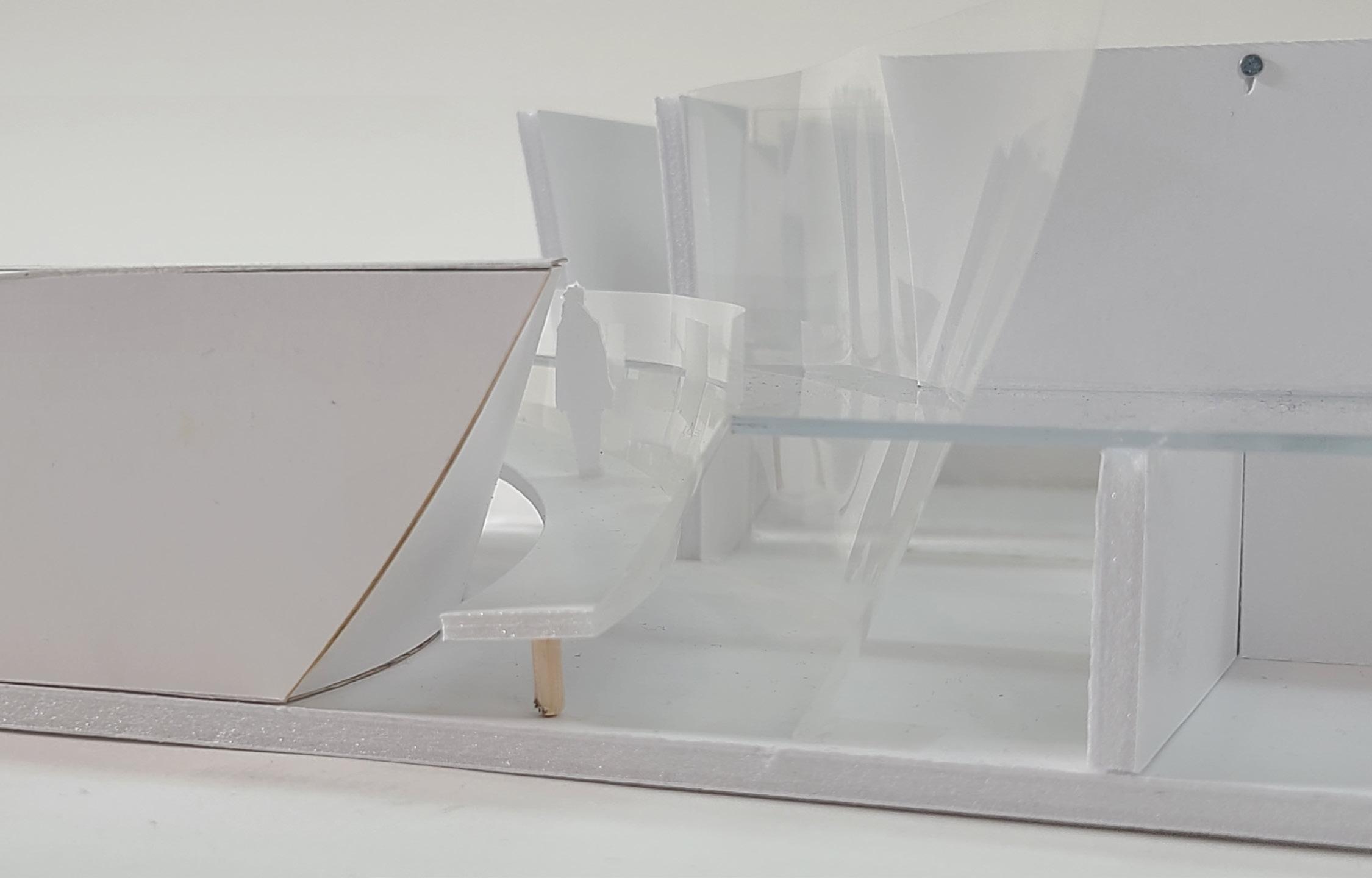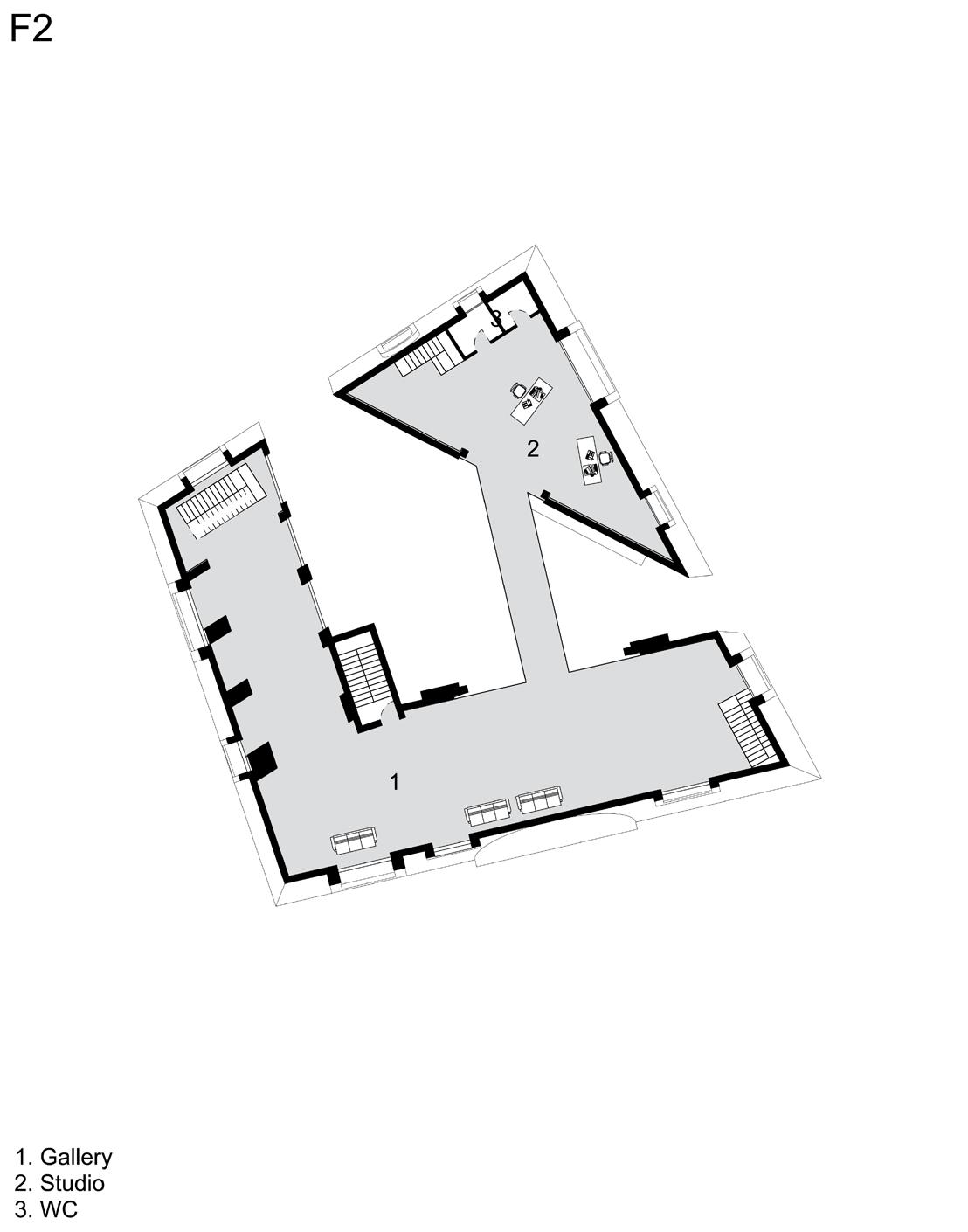 The massing consists of one major volume and a secondary volume that is splitted from it. The split creates for a central public area at the ground floor that provides access to the park located at the back of the building, as well as an open performance platform on the third floor. A bridge is set on the second floor to connect the studio space to the main gallery, allowing the artists to conveniently transfer their works.