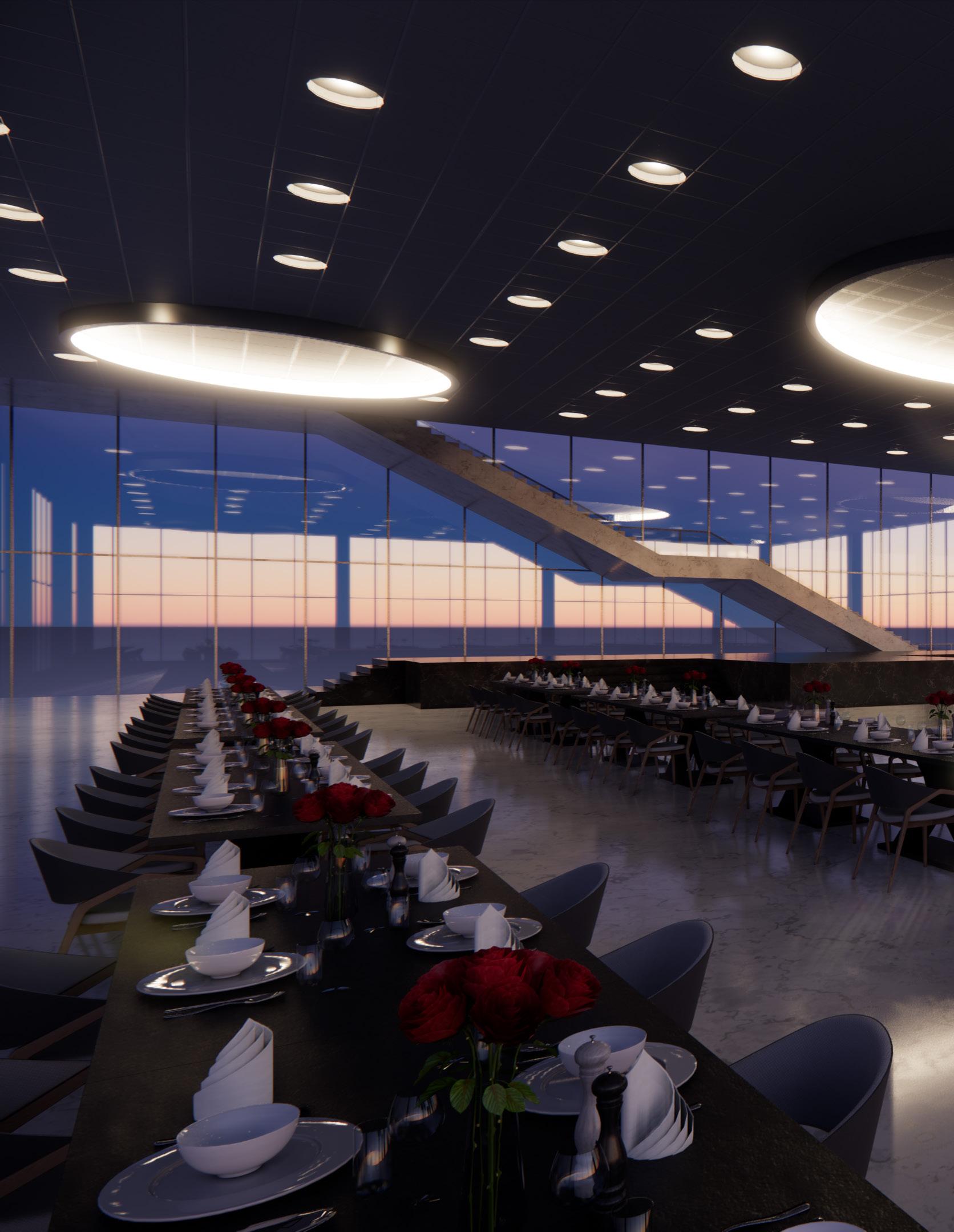 The building starts with a two-story plinth at the ground floor with programs including malls and retail stores to attract the public. The hotel body starts above the plinth, featuring 32 residential floors and a ball room with roof garden at top. Residents can travel between floors through the central elevator at the core, but are more encouraged to navigate the building along the spiral procession that is attached around the facade. The procession is installed with a continuous green space to form a visual connection with the Bicentenial Park located next to the building for more public attraction.