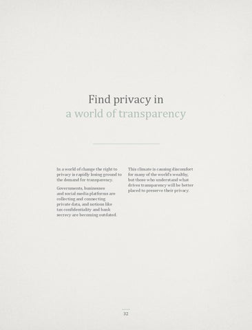 Find privacy in a world of transparency In a world of change the right to privacy is rapidly losing ground to the demand for transparency. Governments, businesses and social media platforms are collecting and connecting private data, and notions like tax confidentiality and bank secrecy are becoming outdated.