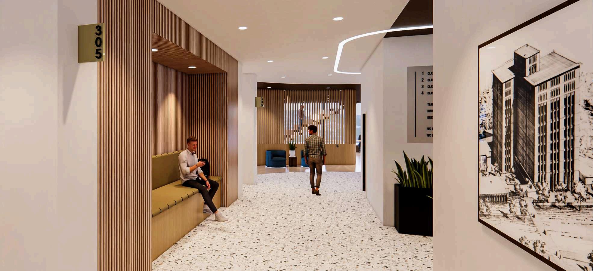 STUDENTLOUNGEWITHVARIOUSSEATINGTYPESFOR FLEXIBILITY.* KITCHENETTEINLOUNGEACCESSIBLEFORSTUDENTUSE.* ACCESSIBLEELECTRICALOUTLETS-FIXEDANDINTEGRATED INTOALLFURNITURE.* LARGESTUDENTCLASSROOMFLEXIBLEFORVARYINGUSE.* PROMINENTSIGNAGEDENOTINGCLASSROOMLOCATION.*