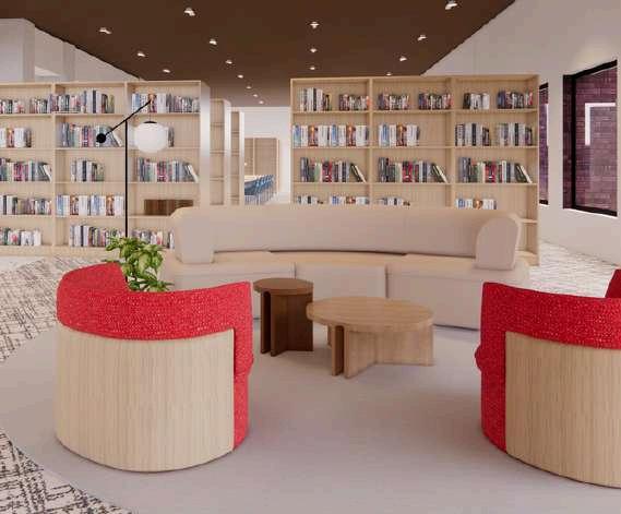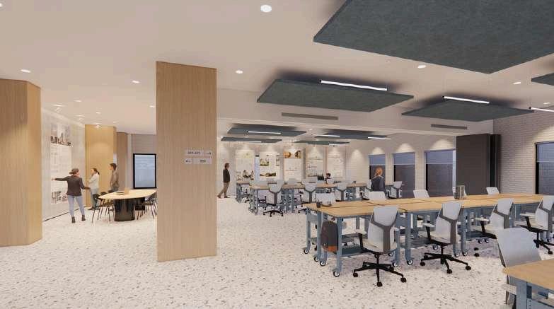 LIBRARYENTRYADJACENTTORECEPTIONDESKFORSECURITYAND DIRECTIONS* COLLABORATIVETABLESLOUNGESEATINGANDINDIVIDUAL WORKSTATIONS* BANQUETTESEATINGFEATURESACOUSTICWALLCOVERINGFOR NOISEMITIGATION* TABLESFORLECTURESANDVIDEOSCREENINGS LIBRARIANOFFICESANDLARGESTORAGESPACE ADJUSTABLEBOOKSHELFSFORVARIOUSRESOURCES SOCIALSTAIRSLEADINGTONINTHFLOOR-WITHROOMTOSIT, WORK,ORSOCIALIZE*