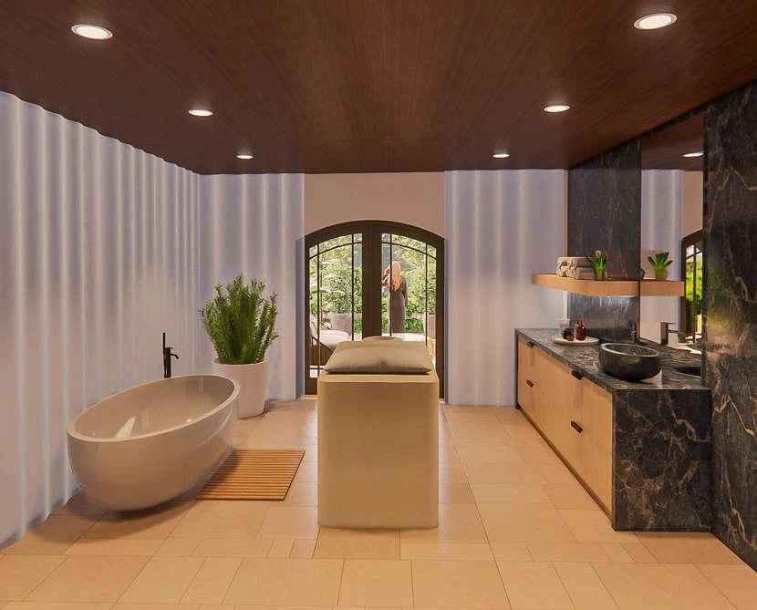 A cove is a peaceful nook of a body of water where the waves meet the land. They are secluded little spaces that are quiet and serene. Throughout the design, the curved shape of a cove will influence many aspects of the project. The floor plan will follow along the curved edge of the river on the site and use the landscape to bring the design into nature. The interior of the building will be highlighted with arched doorways and hallways. There will also be coved ceiling details and lighting throughout the spaces. Like the rugged cliffs around a cove, different stones will be the feature of walls and furniture. The water in a cove will be represented with fountains and water features that create ambient sounds for relaxation. With the use of color, harmony will be brought into the space. Blues and greens will resemble water, and whites, creams and tans will resemble stone and sand. The use of linens will bring soft and comforting textures to the design. A calm environment will be achieved by balancing between all of the materials and details throughout the project.