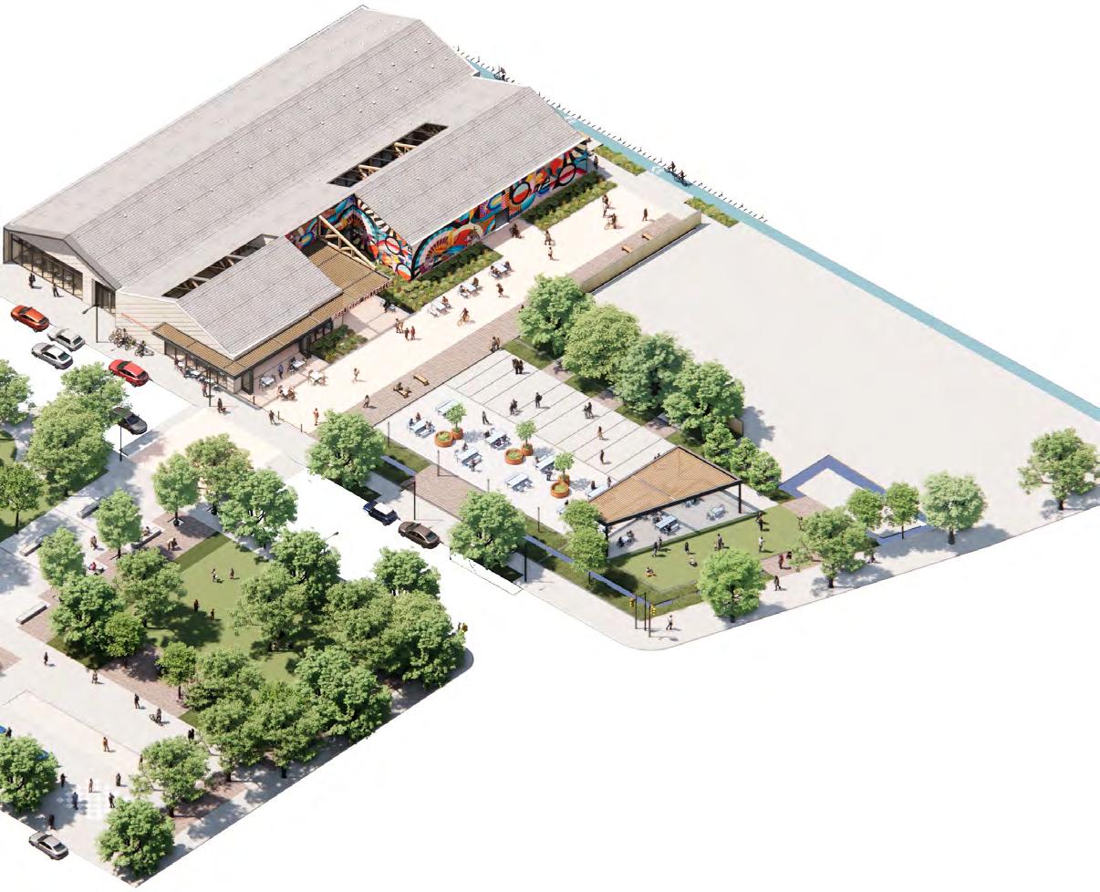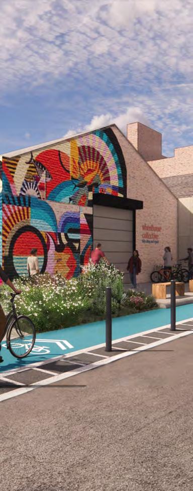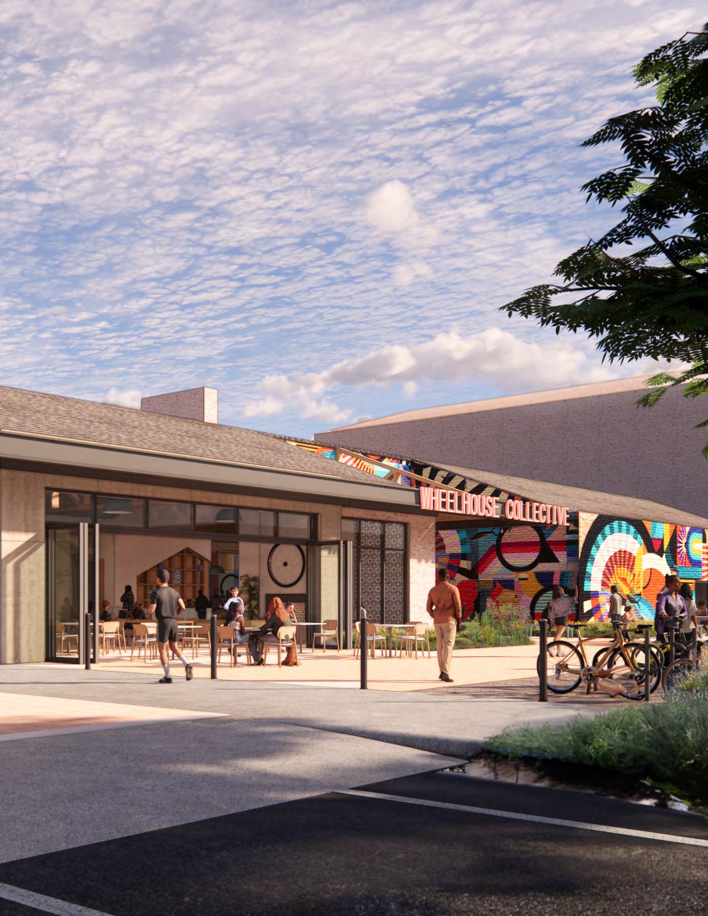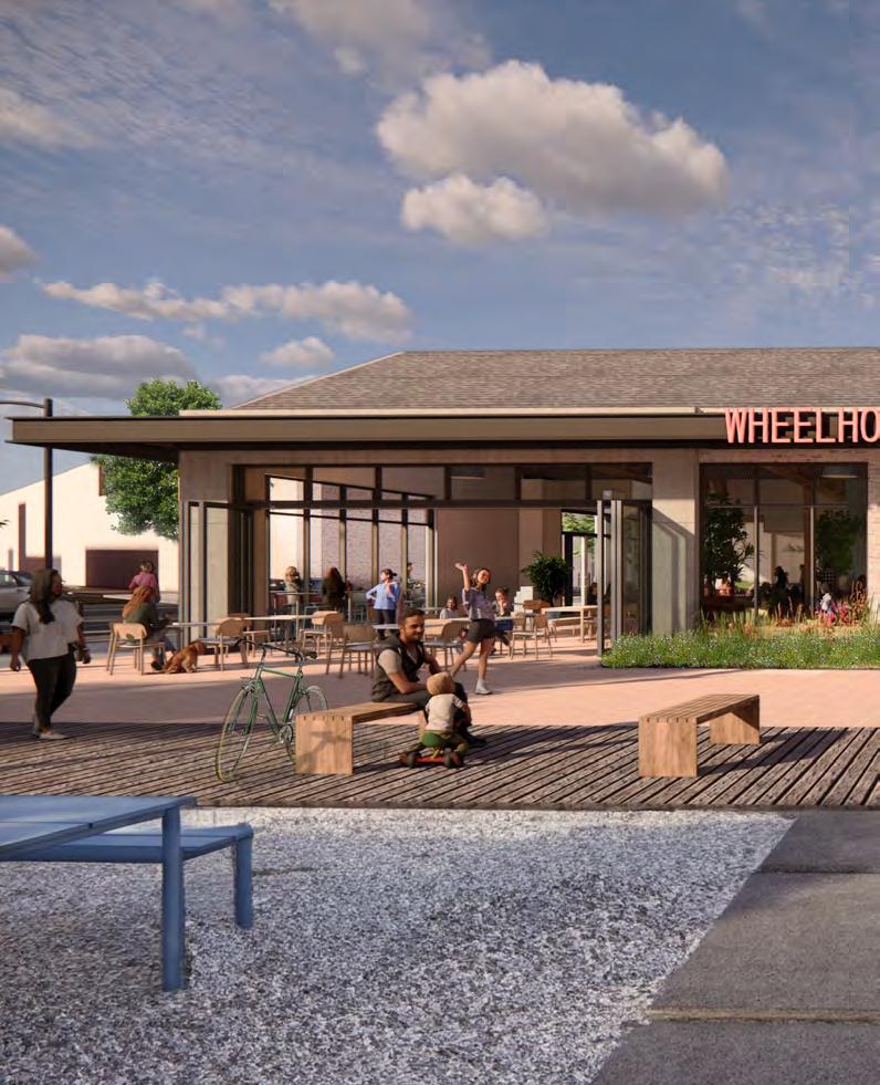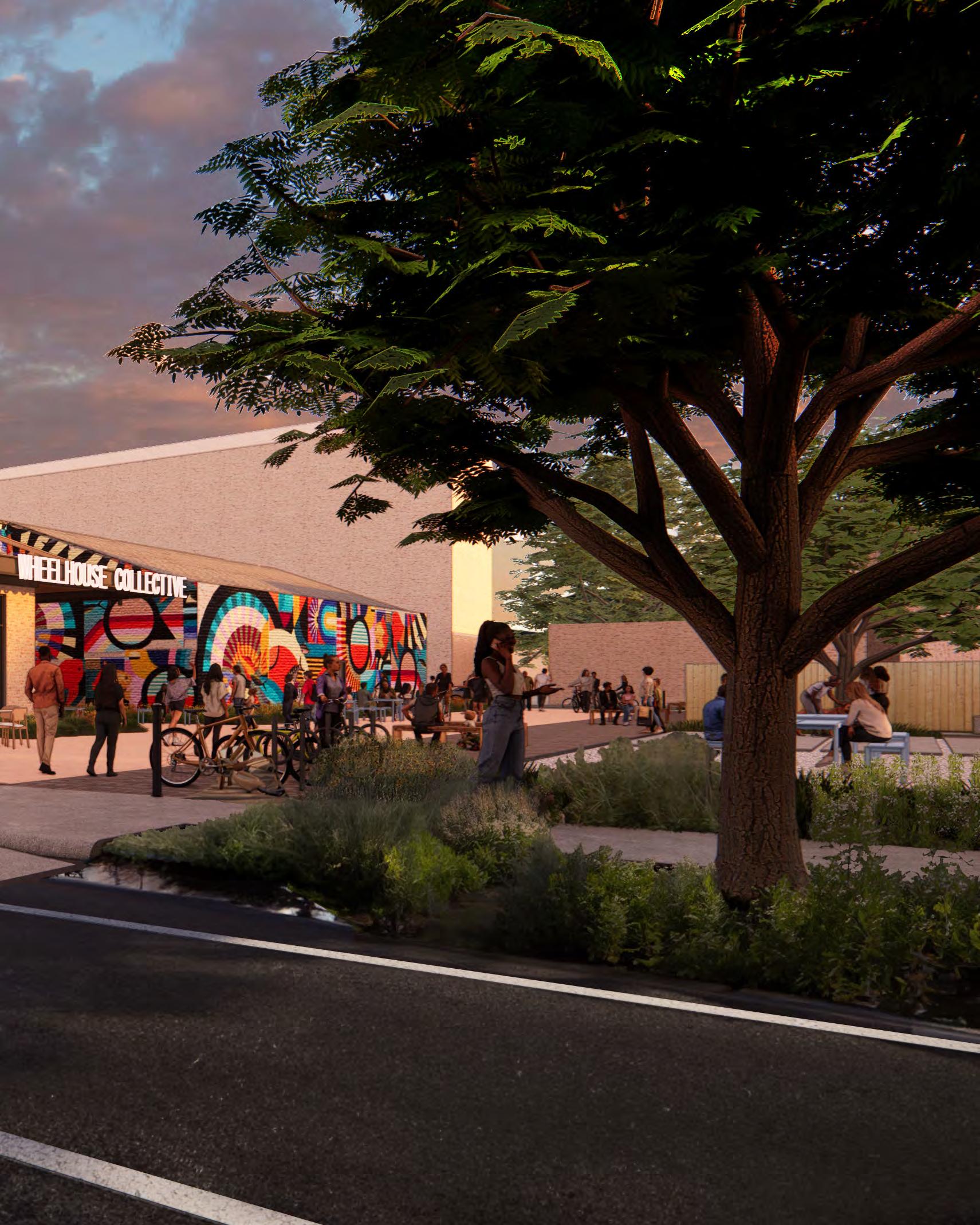 The exterior spaces also celebrate the artistic identity, biking culture, and the diverse community surrounding the hub. There are a range of gathering spaces between wheelhouse collective and Palmer Park, fostering community engagement and providing opportunities for a variety of events. There is also an improved biking infrastructure surrounding the building, protecting cyclists and connecting them to the main bike lane system.