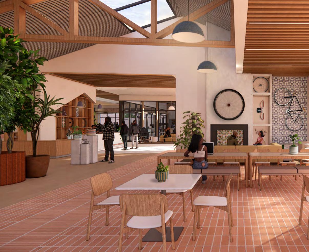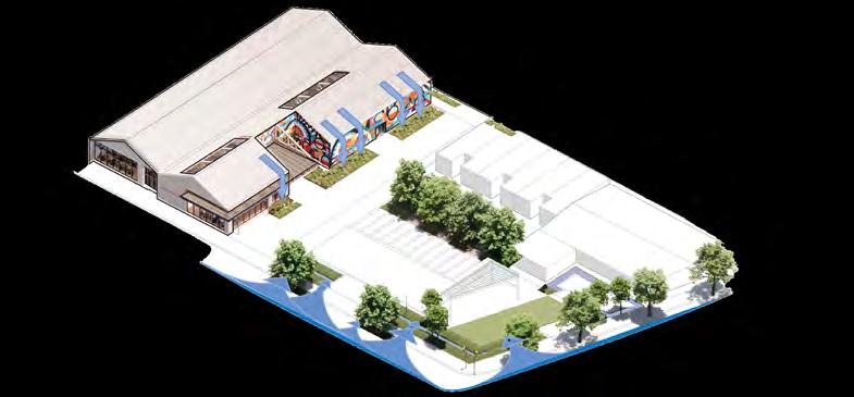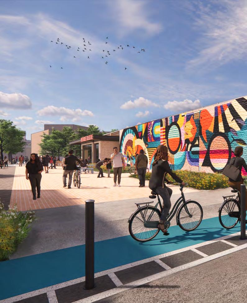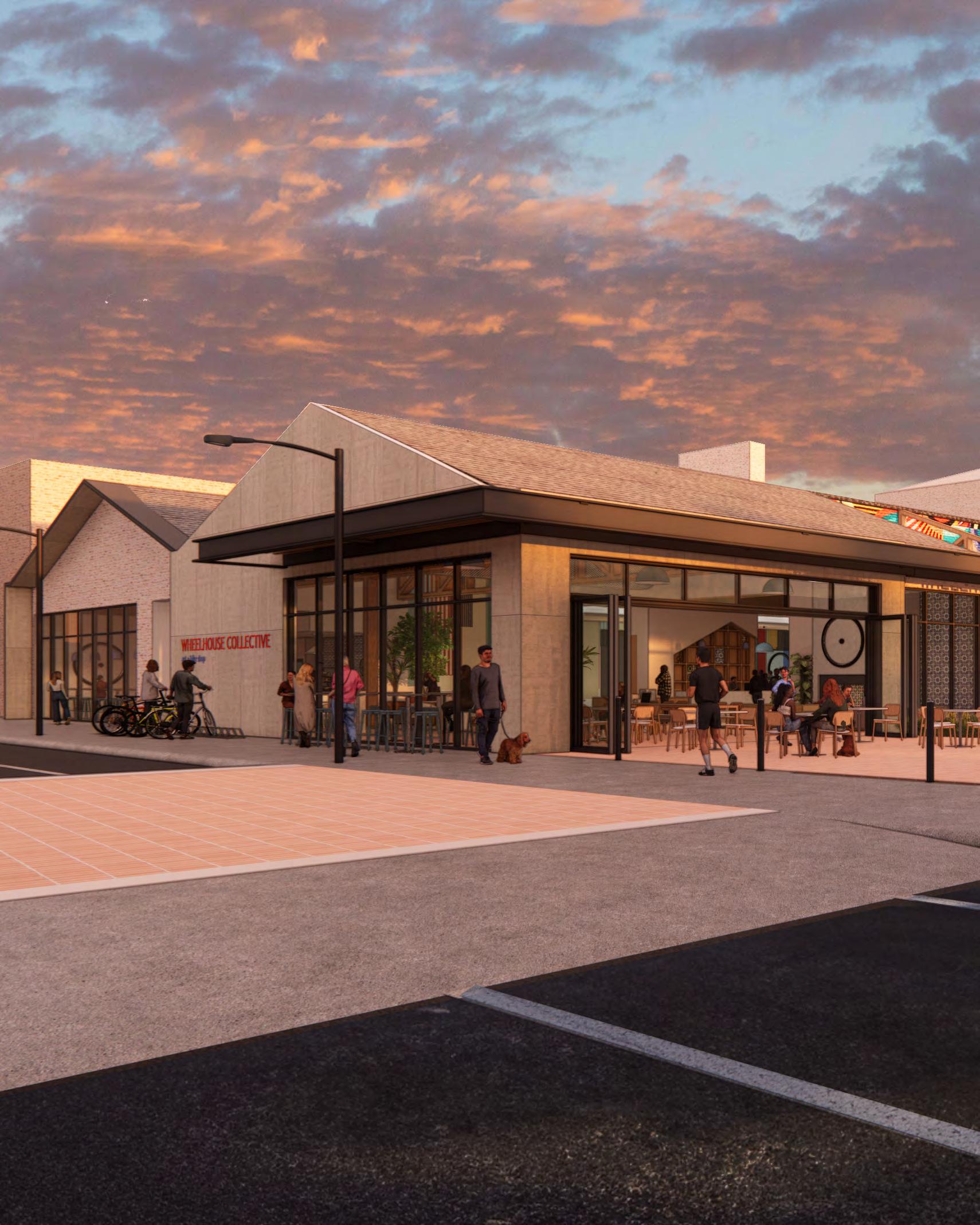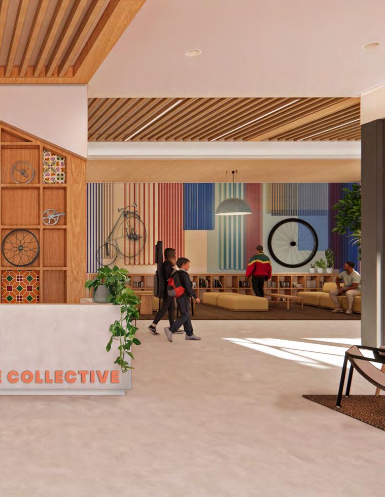 The exterior spaces also celebrate the artistic identity, biking culture, and the diverse community surrounding the hub. There are a range of gathering spaces between wheelhouse collective and Palmer Park, fostering community engagement and providing opportunities for a variety of events. There is also an improved biking infrastructure surrounding the building, protecting cyclists and connecting them to the main bike lane system.