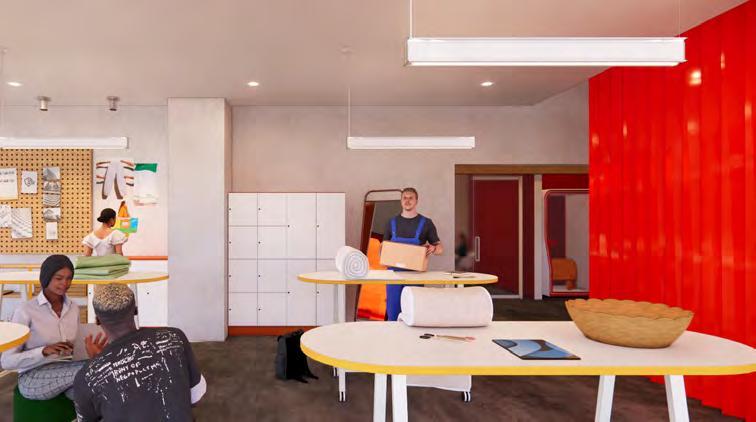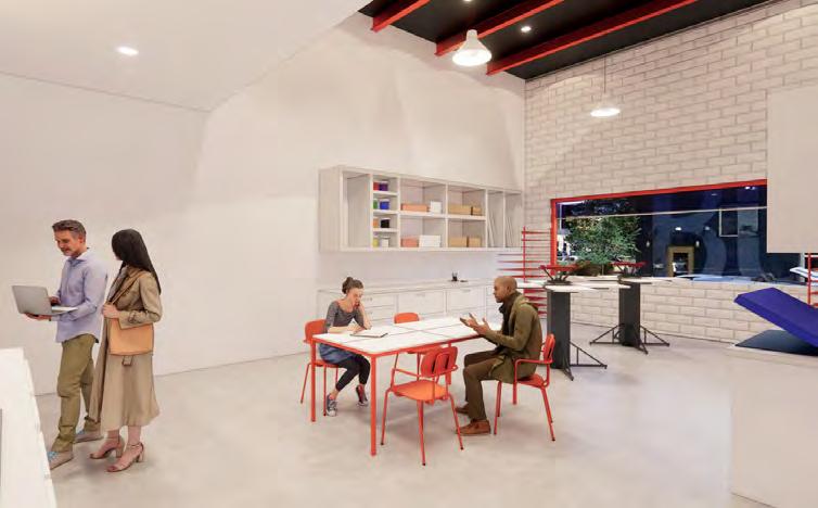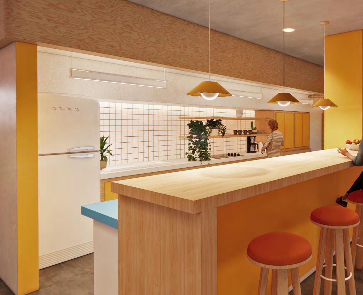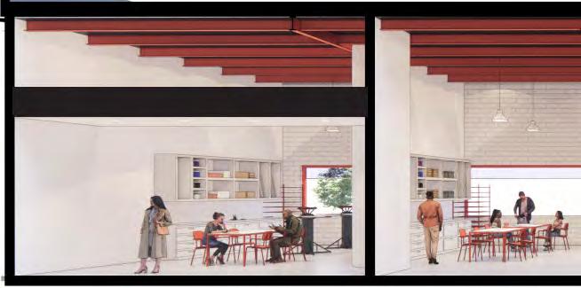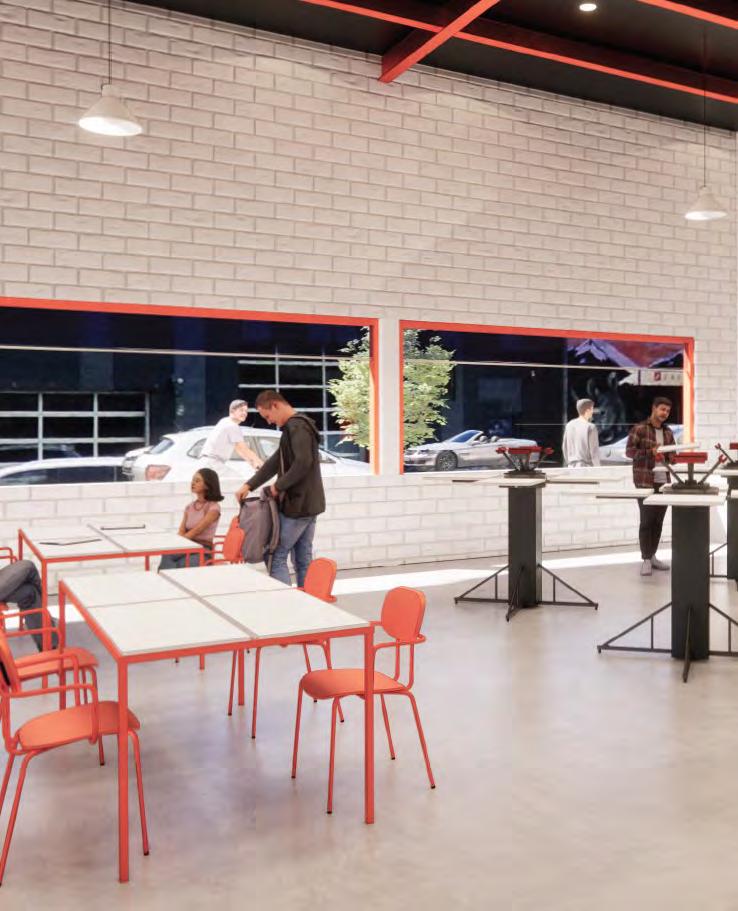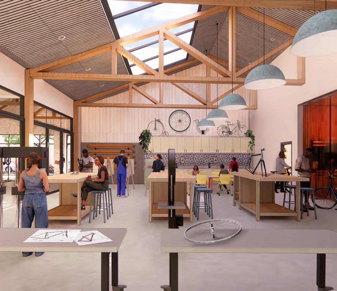 The interior of the community hub has a programmatic focus on supporting the biking community in addition to creative expression. The floor plan remains open to allow spaces to flow into one another. With the Kensington High School for Creative Performing Arts nearby and the additional creatives in the community, the art studio and maker spaces inside support a wide variety of users.