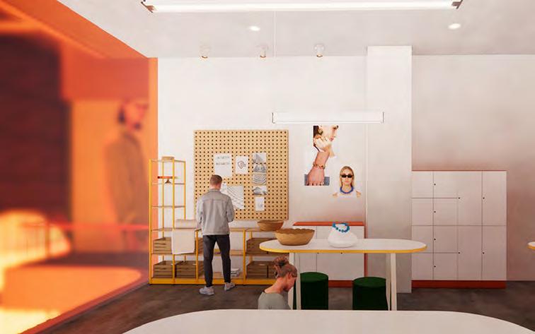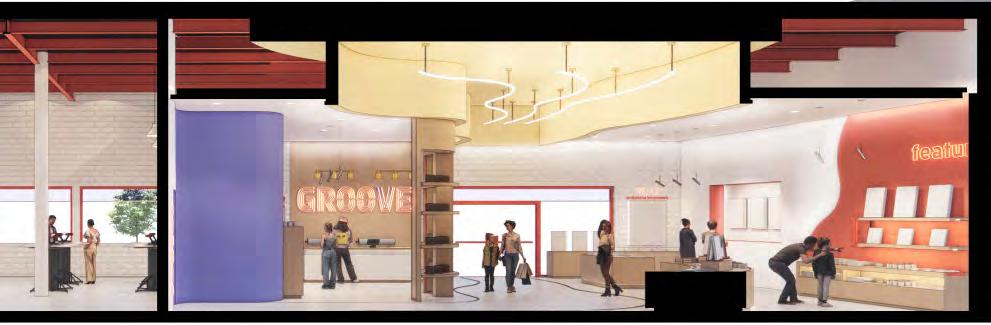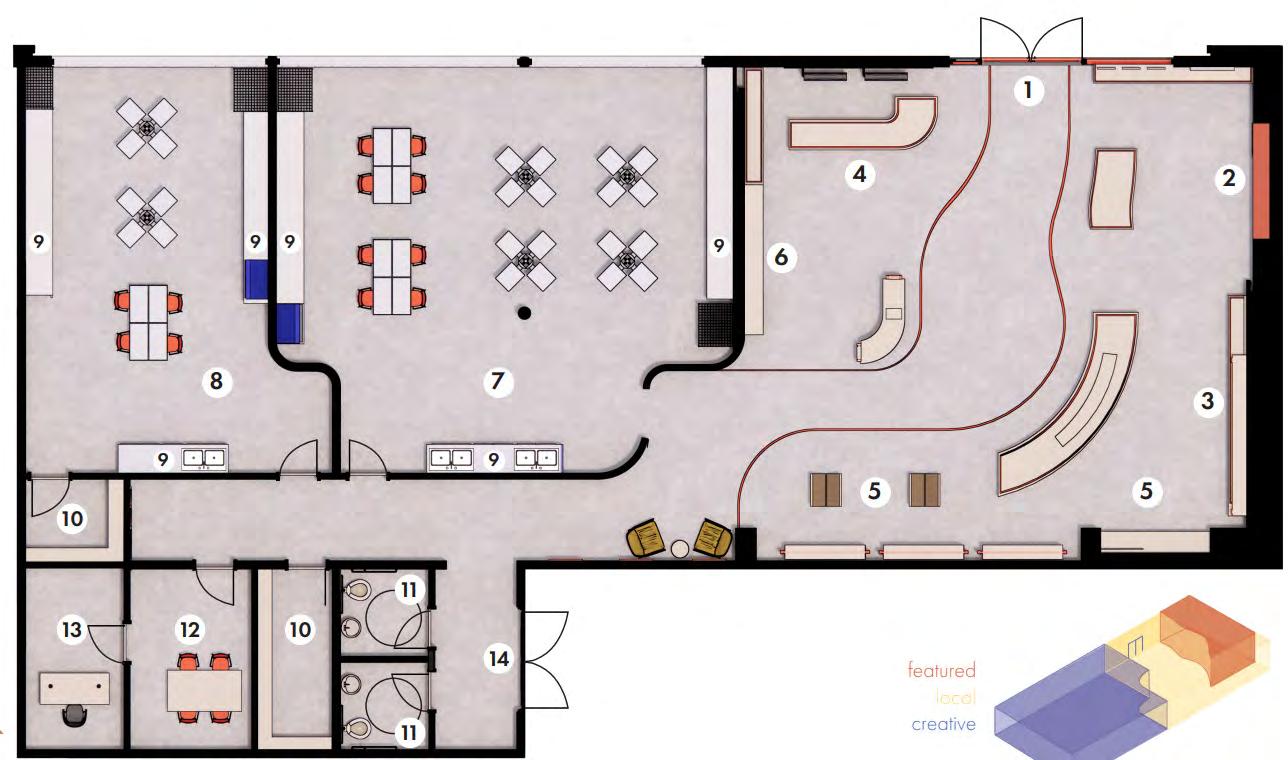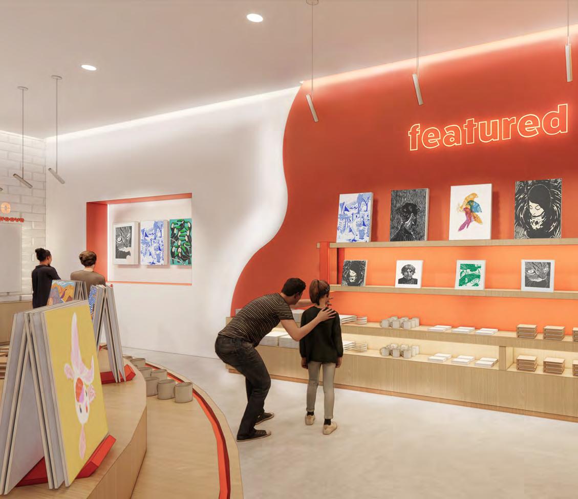 The first thing users encounter when entering the retail side is an exciting, creative, and colorful display of art work. This design promotes much more organic use of forms, lighting, and color. The color-blocking is seen immediately to break up some of the different areas inside while still allowing engagement to thrive.