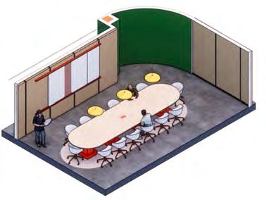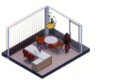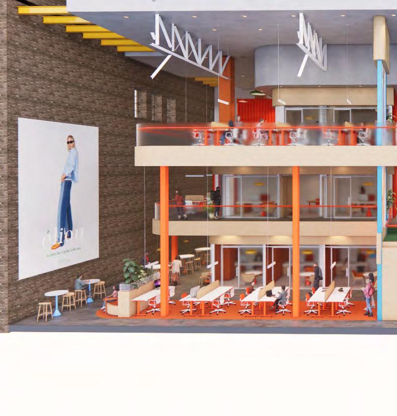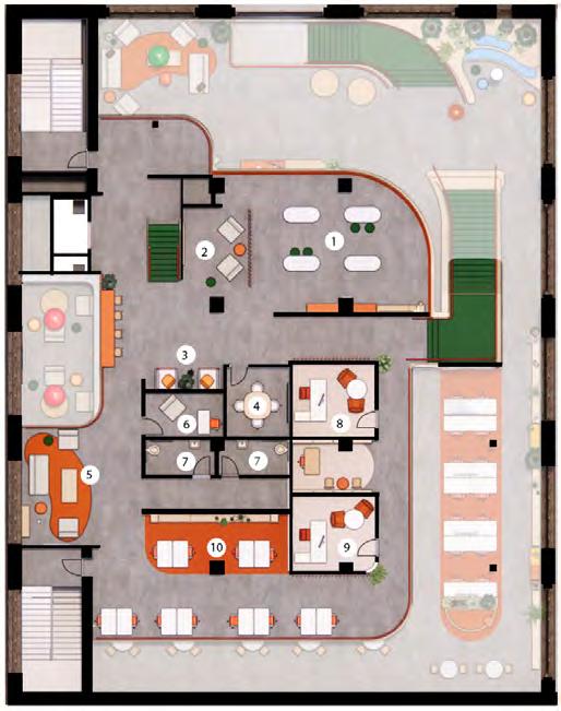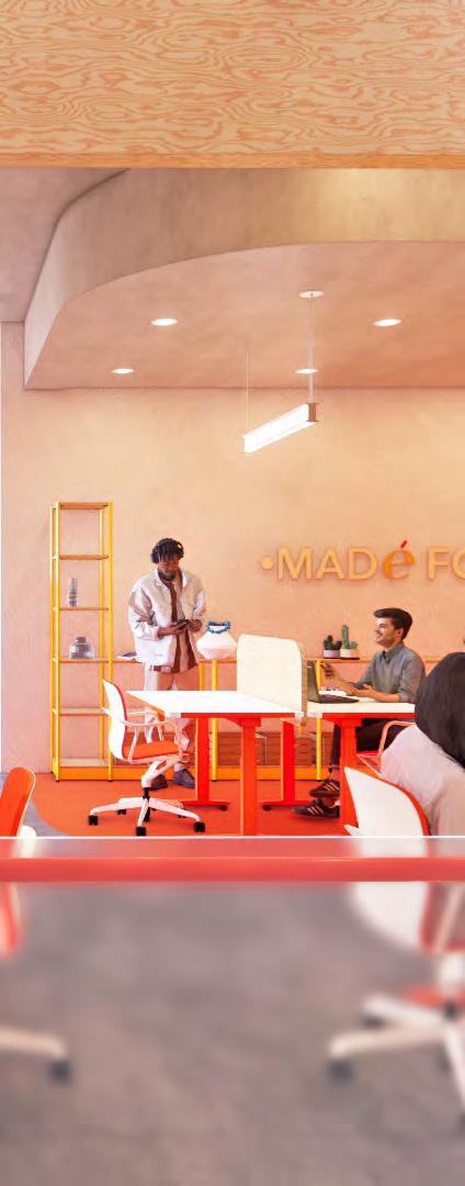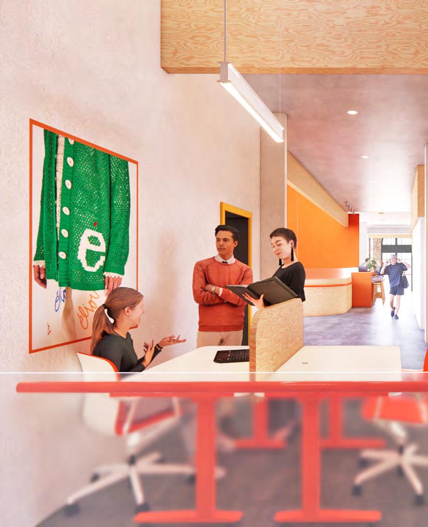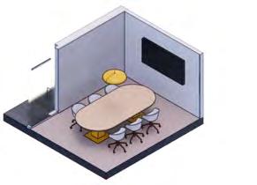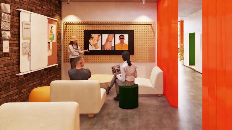 The second floor introduces more variety to conference spaces with small meeting rooms. The open work space continues the independent language and encourages collaboration. This floor also features phone booths, quiet spaces, and the main feature on this floor being the clothing fabrication space. This studio allows for pin-up, fabrication, and modeling of pieces.