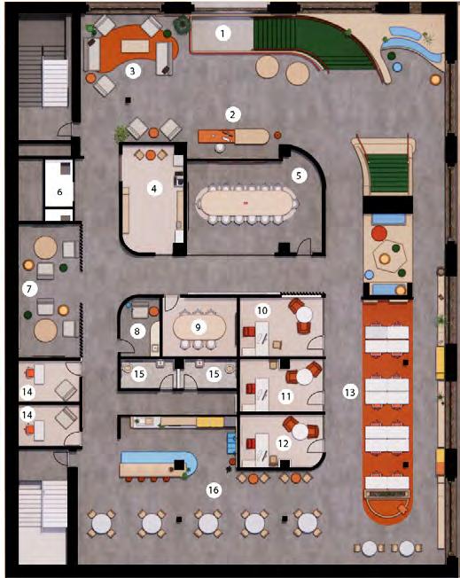 The main floor is home to some spaces that are specific to this floor to give access to those visiting and working in office. One of these being the large conference room. This sits near the CEO, CPO, and CTO offices as well as the open office space. The floor plan is incredibly open, giving independence to users to have choice over their day to day work life. Additionally, there is also a work cafe, large pin-up, and resource center on the main floor.