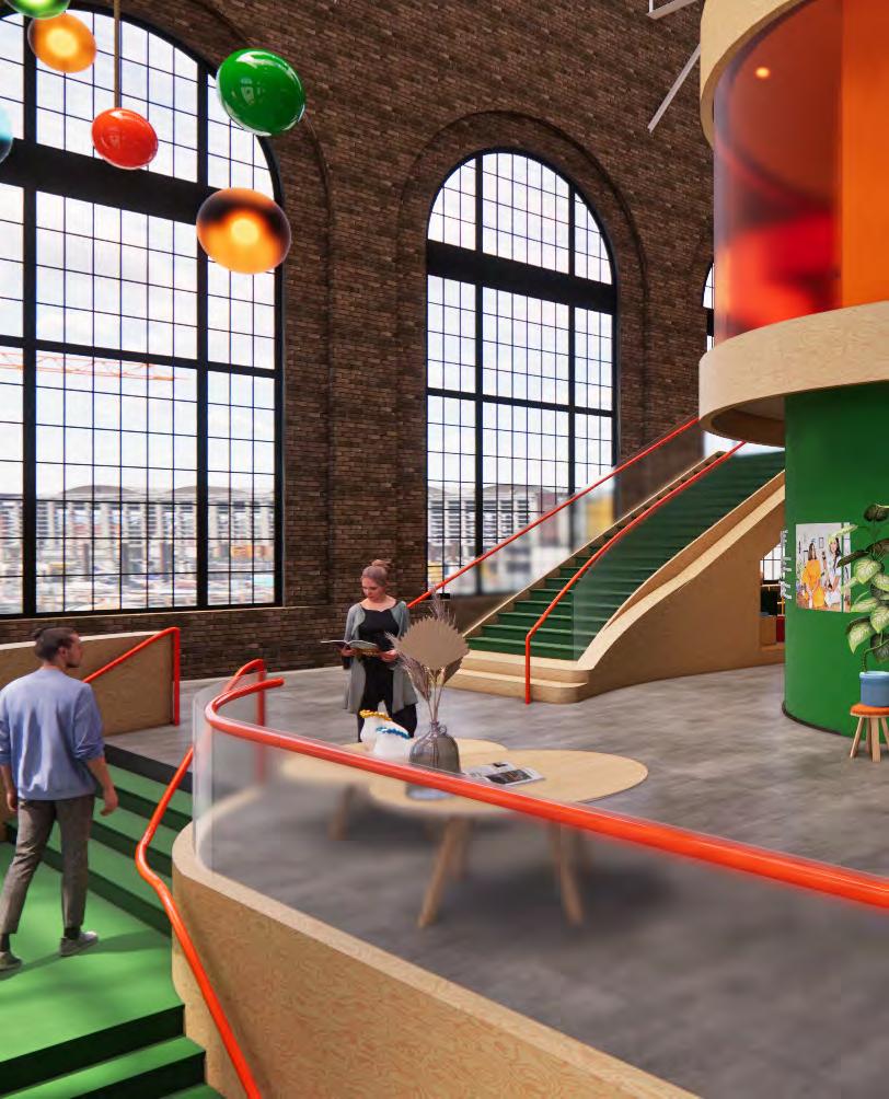 There were three major design strategies used to make the original shell more dynamic while respecting the adaptive reuse of the building.