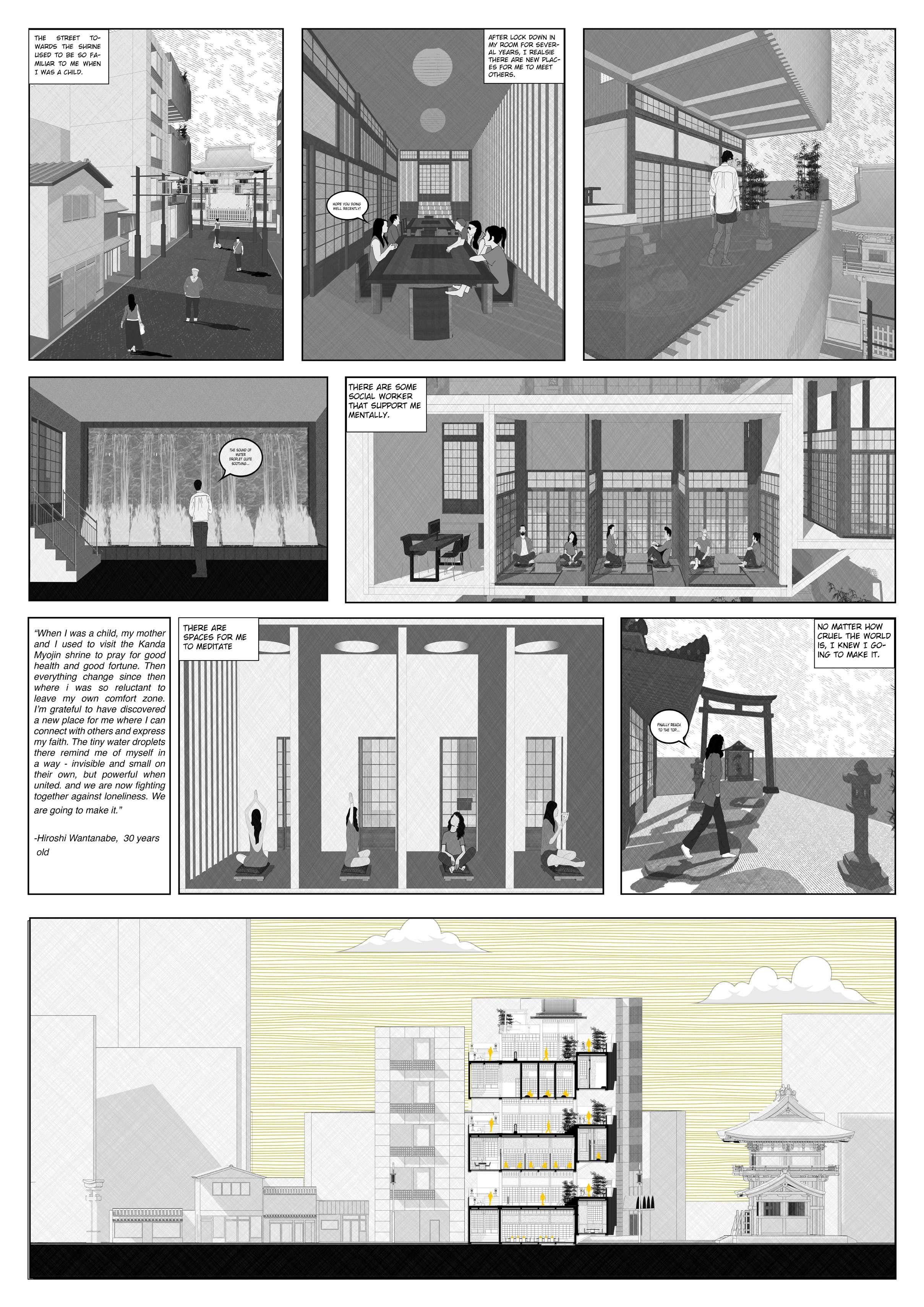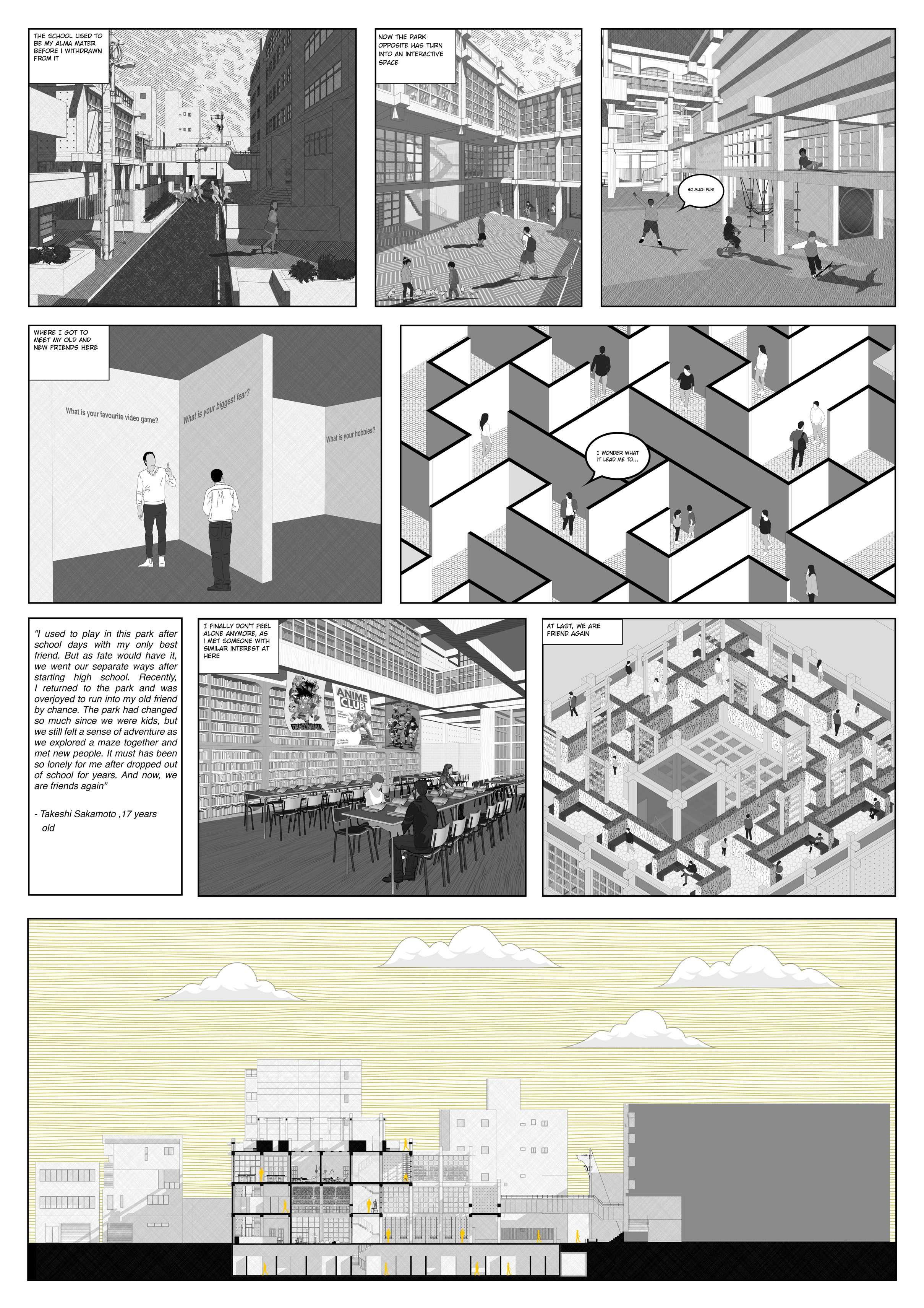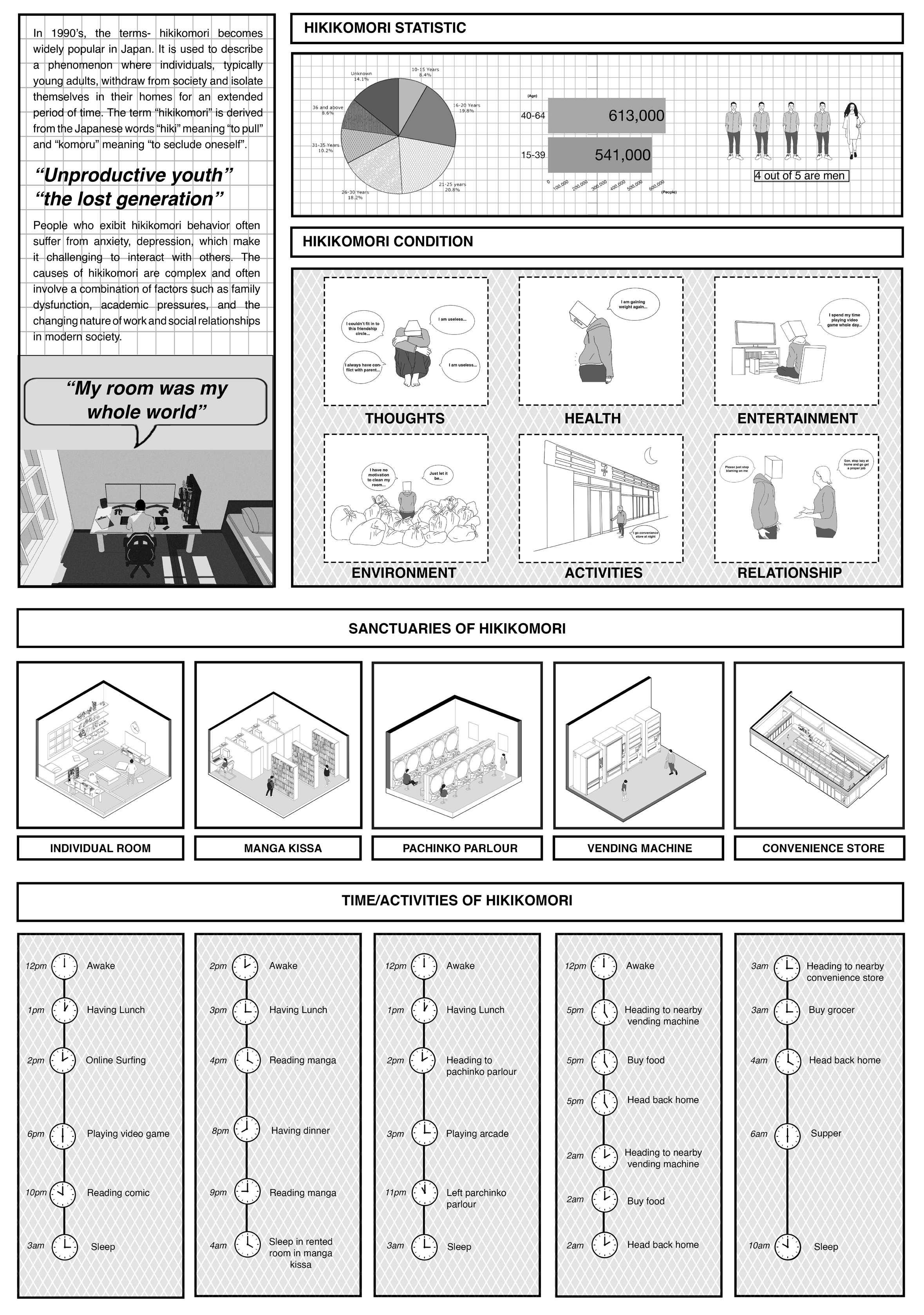 Hence, the proposal is rather a hypothesis idea. By reimagining the electric town, Akihabara, as a hikiko-friendly city, creating a place of celebration for hikikomori to build their own community, gradually reconnect to the society, and set their own social values and in the meantime seek to address the jobless and mental health issues of hikikomori.