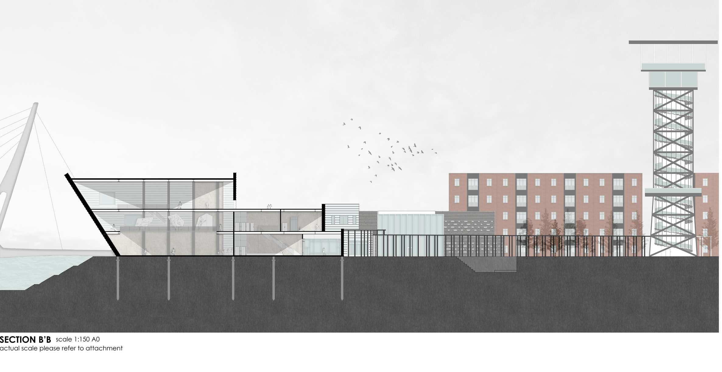 The wood facade create restricted but focus the view towards River Clyde, and the shadow view change brought in certain level of spatial level of spatial quality into the space.