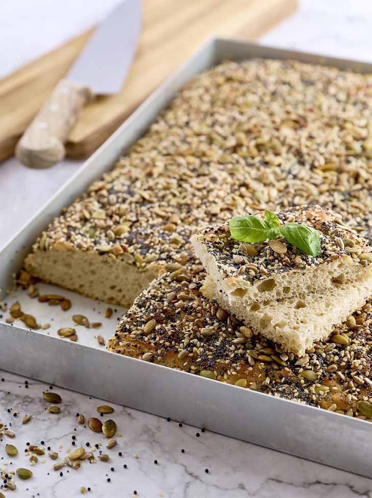 Dag 2: Vik ihop degen och överför till en stor kapselplåt med lite av rapsoljan i botten. Låt jäsa cirka 60 minuter eller tills den känns riktigt luftig. Tryck hål i degen med fingrarna och dra ut den så den fyller hela kapseln. Fördela resterande rapsolja och strö över flingsalt. Baka av enligt anvisningarna. Degbearbetnings-/visptid