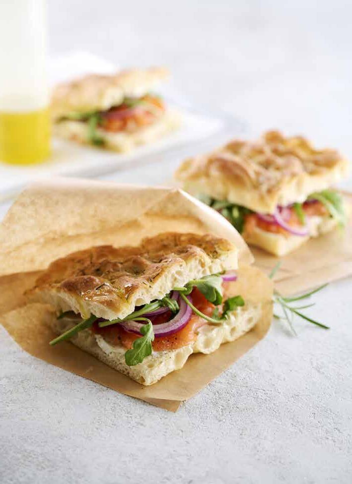 Baka focaccia i en kantplĂ„t enligt grundreceptet. Dela den fĂ€rdigbakade focaccian i 20 bitar (cirka 80 gram styck) och dela sedan varje bit och bred pĂ„ fĂ€rskost, lĂ€gg sedan pĂ„ lax, rödlök och sist ruccola. LĂ€gg pĂ„ âlocketâ pĂ„ och placera förslagsvis i en hamburgerficka (art nr 77026).