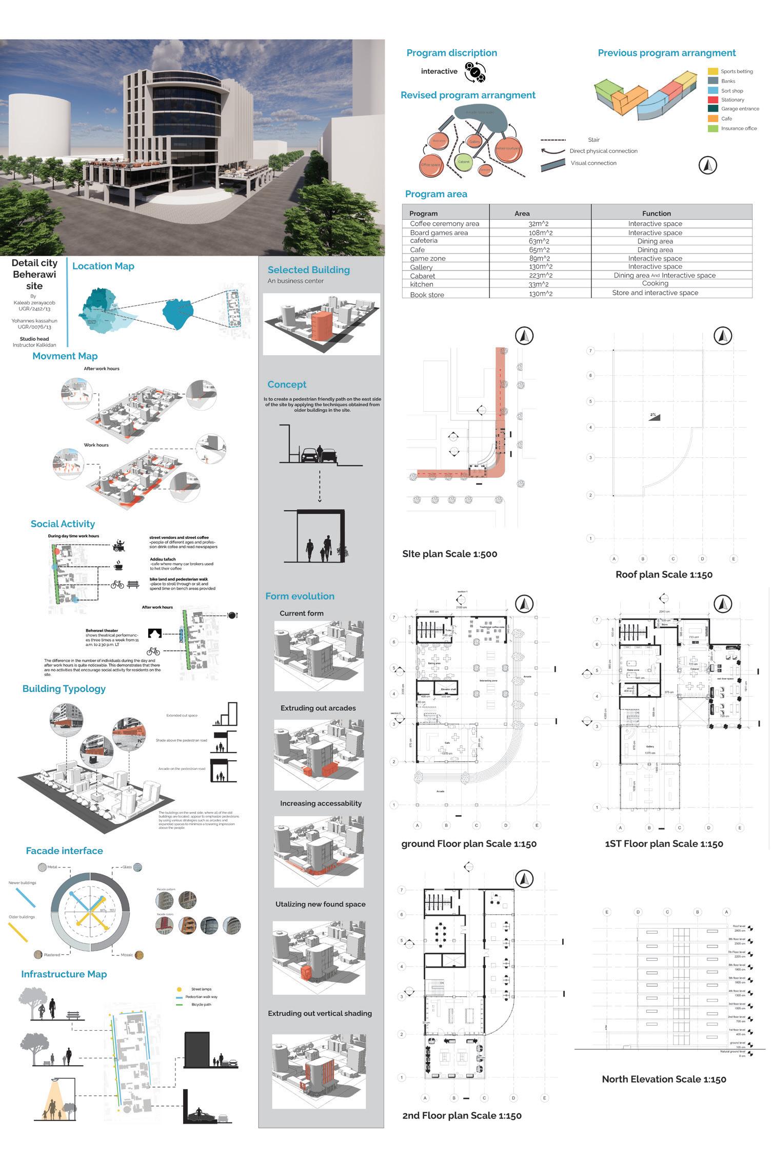 Using the information acquired about the site, we changed an existing building on the site by creating arcades on both walk ways and entirely opening up the bottom floor to improve interaction among the people on the site. The newly found space above the arcades is being used for programs that could improve the site’s nightlife.