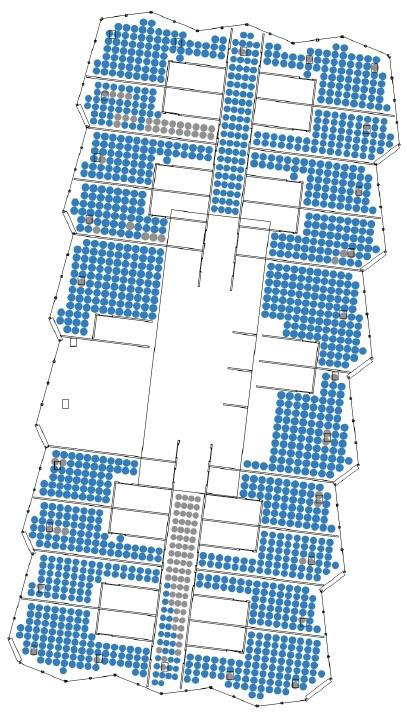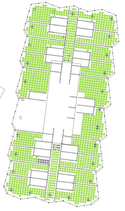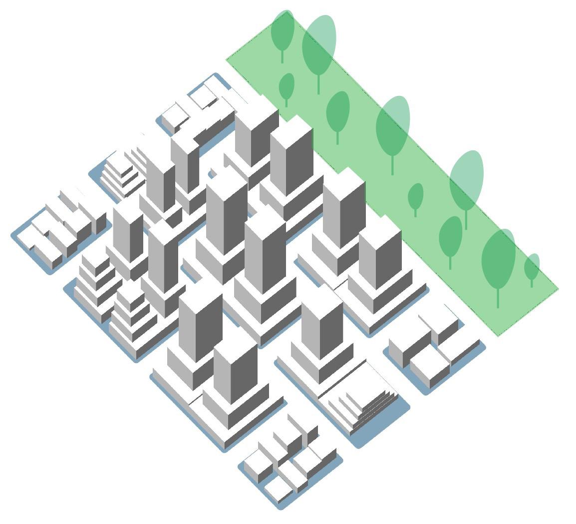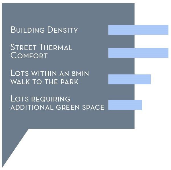 Finally, the introduction of a park into the fabric will help me determine which combination of building density and street grid layout results in more parcels located within an 8-minute walk to the park and additionally, identify configurations that require fewer additional green spaces to achieve optimal temperatures along the streets.