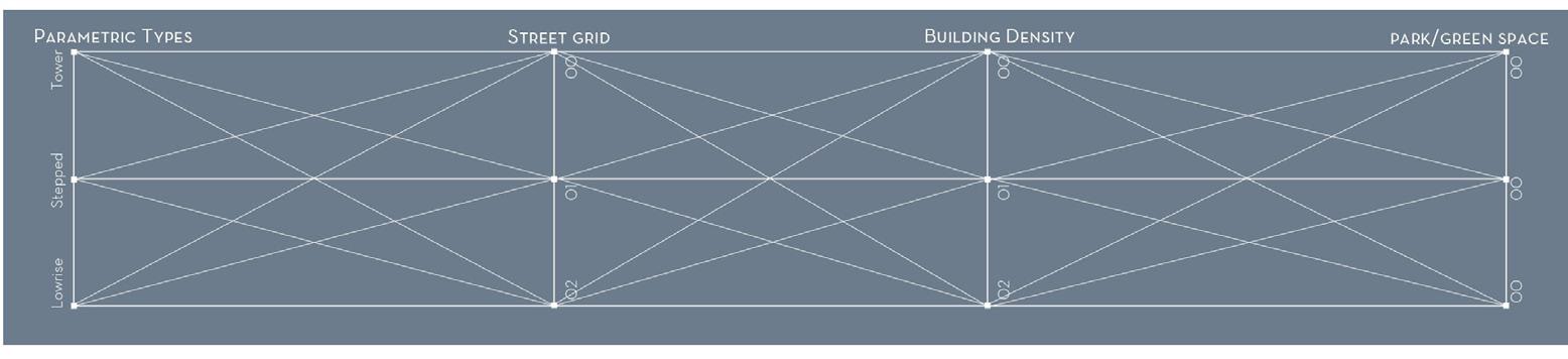 This analysis framework begins by examining the relationship between three different building density distributions and three distinct street grid layouts. Each density distribution, such as distribution 01, will interact with all three street grids in a similar process applied to the subsequent density distributions.