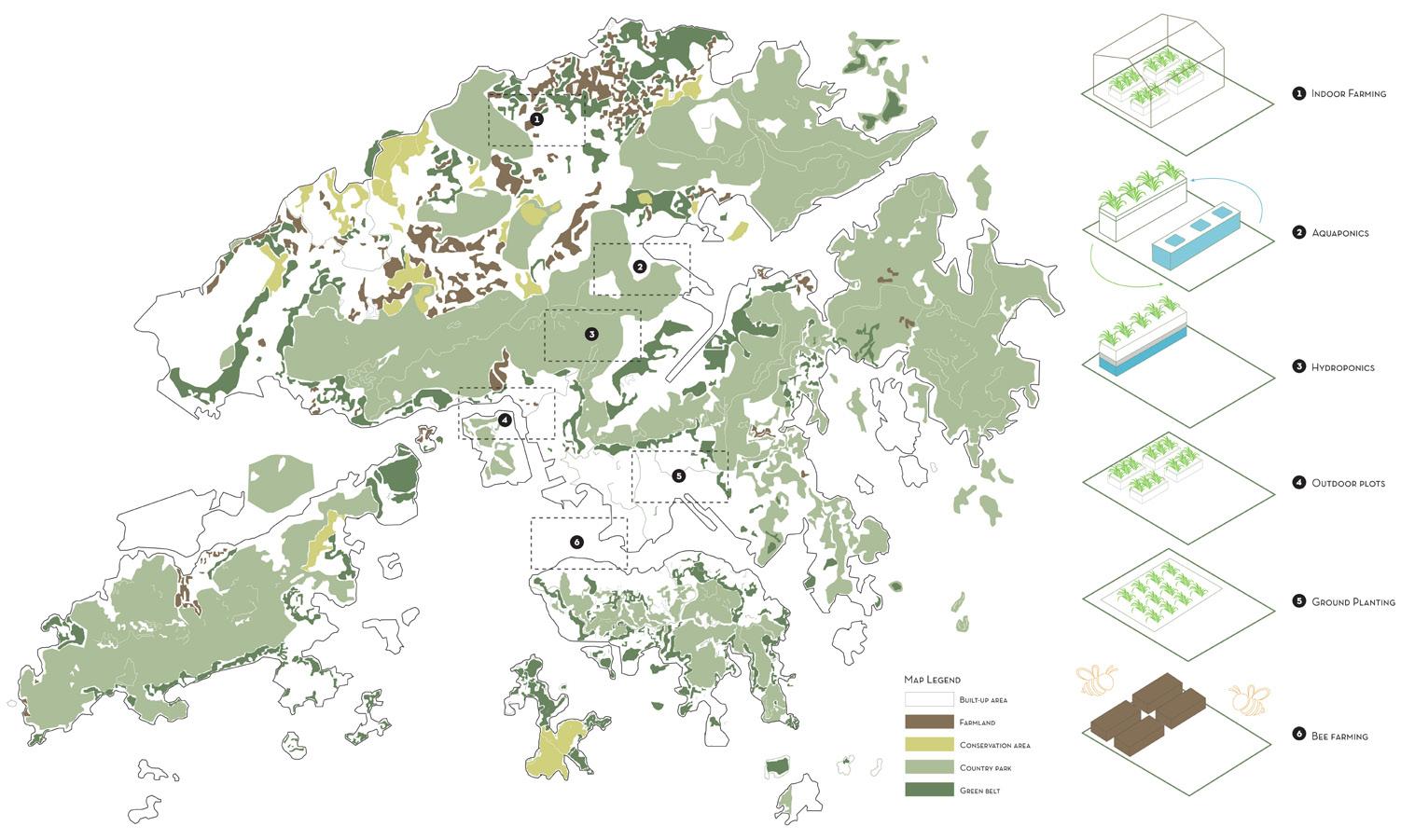 Mapping Urban Farming Typologies, Hong Kong city (Rethinking the Potential of Urban Farming / Valuing social benefits in Hong Kong. (n.d.). Ting WANG.)