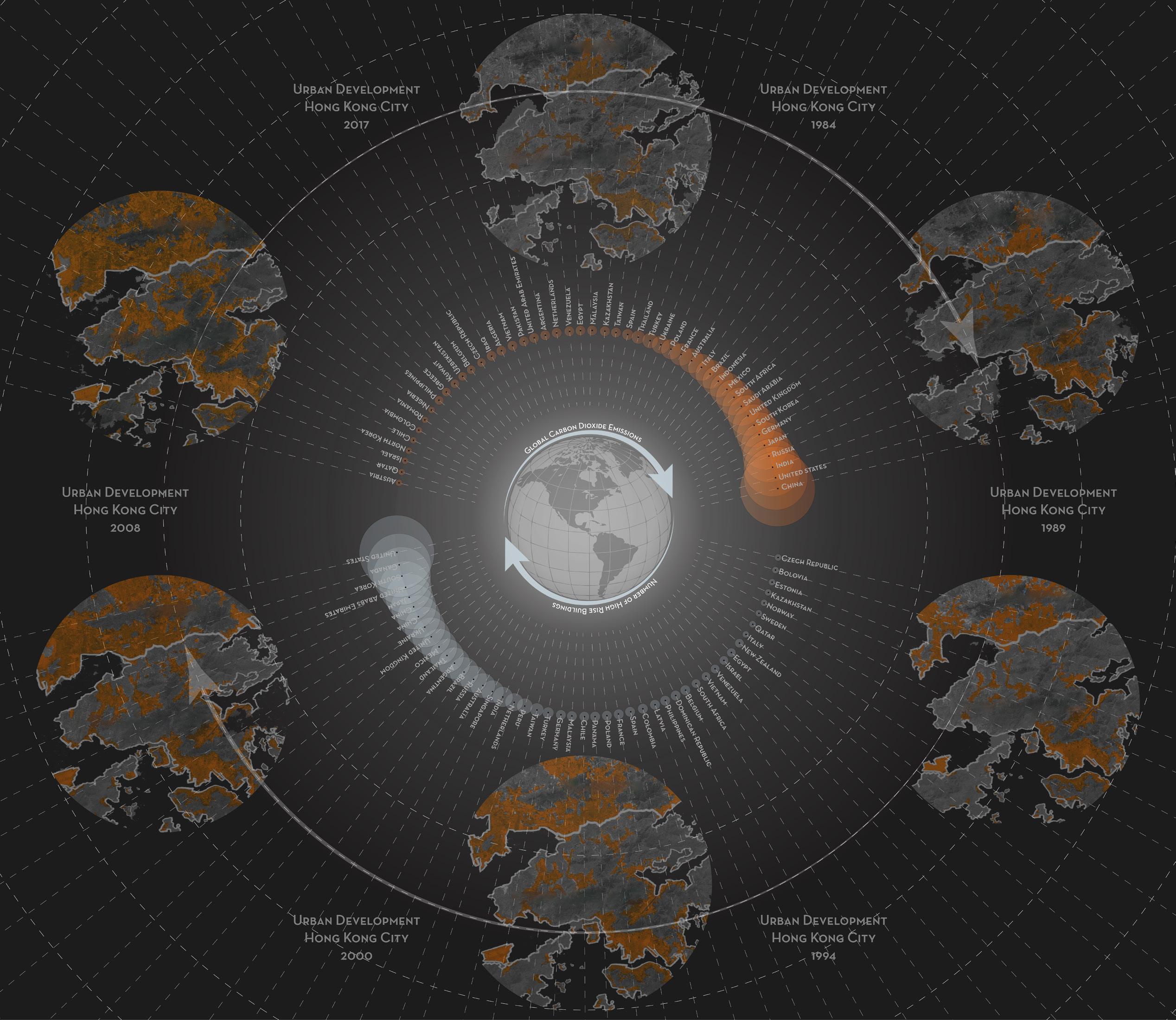 Mapping the number of residents in each square kilometre of a 100 by 100 kilometre region for London, New York and Hong Kong. The city that stands out in the mapping is Hong Kong, with its extremely high residential densities exceeding 110,000 people per km2. Here planners have responded to scarce land availability with very tall (over 30 storeys) high-density development. Scarce land has also influenced the development of New York City, where Manhattan densities peak at 59,000 people per km2. London in comparison is much lower density.