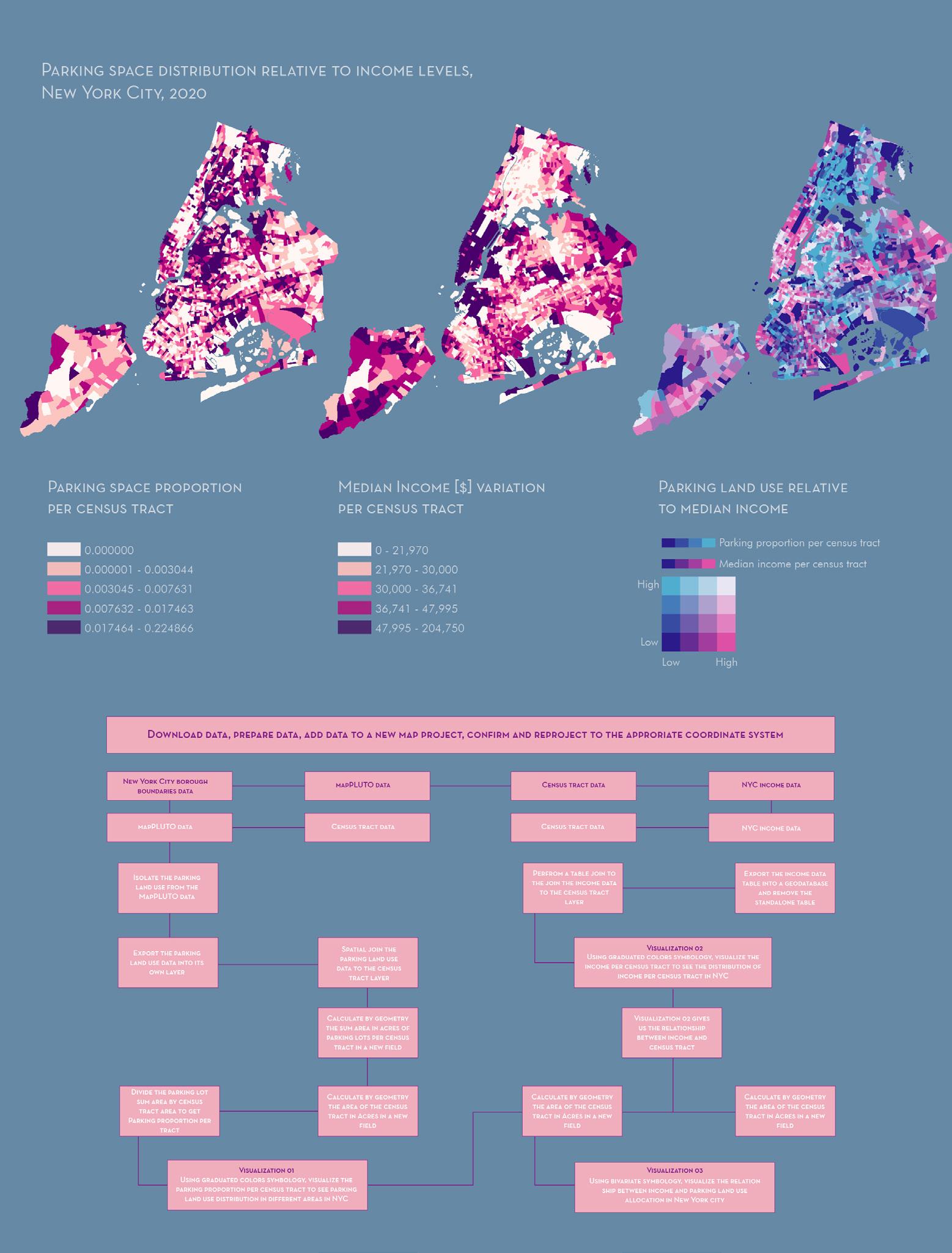Methods : Table Join, Querying by Attribute, Geoprocessing, Summary Statistics, NYC Open Data, ACS, Census