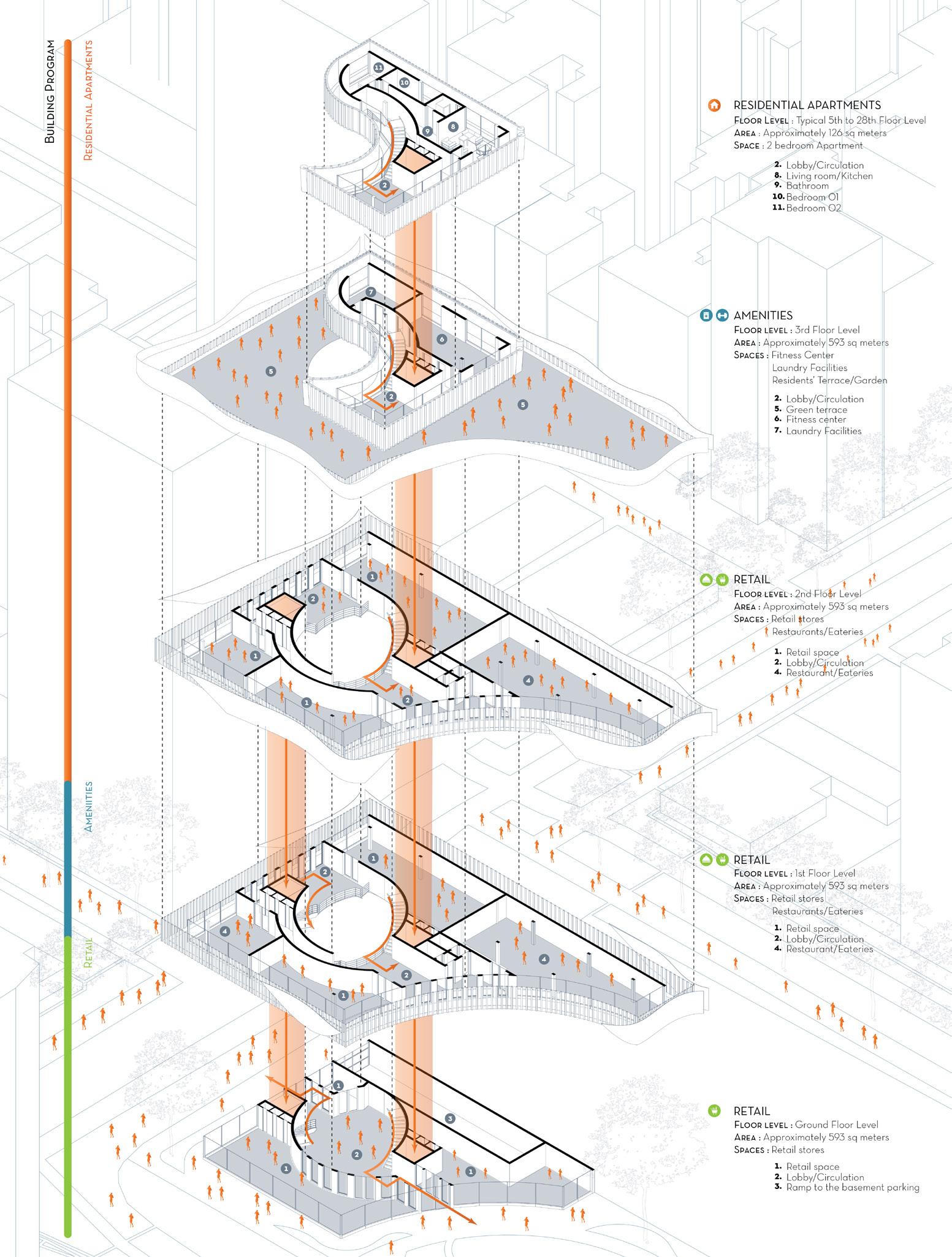 Assume the developer is looking for assurance that your design meets all of their criteria and you can execute on the complex nature of the design. Your design must conform to all zoning and program requirements, unless a viable alternative is proposed and presented with a clear argument and backup data. Consider all existing pedestrian walkways and vehicular circulation. Pay special attention to the existing public plaza.