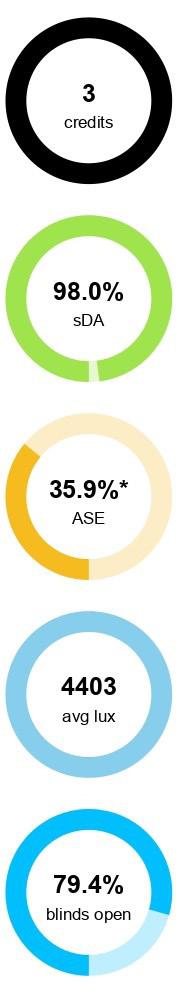 Sunlight exposure (1000 lux direct) Sunlight exposure (1000 lux direct) Sunlight exposure (1000 lux direct) ASE 27.53% ASE 39.96% ASE 40.30% Quality View Analysis Report Daylight Availability Report
