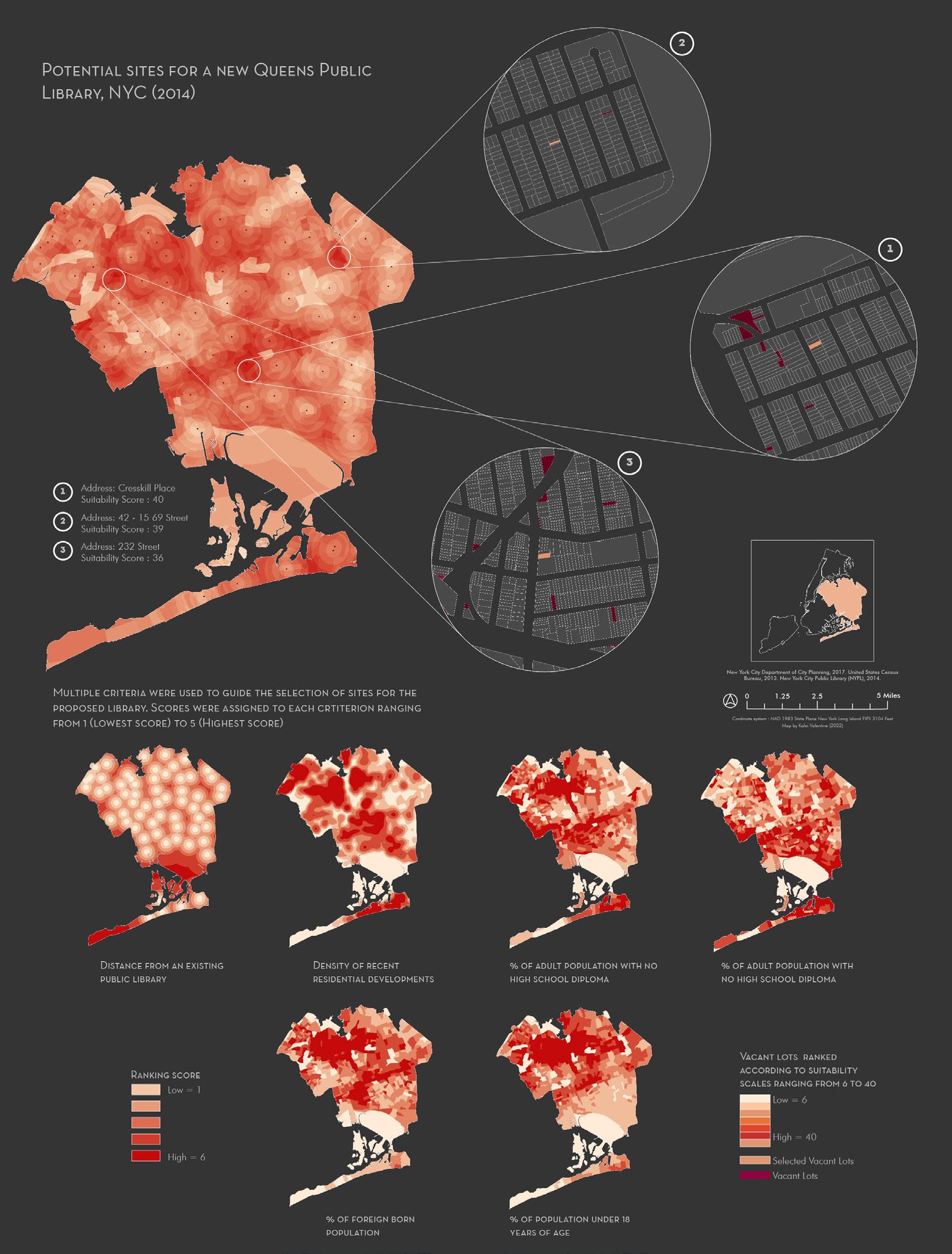 Through a multi-criterion decision analysis, I mapped the suitability of sites for a new public library in Queens, New York. The suitability of the vacant lots was calculated by performing map algebra on the following decision layers: distance from the nearest public library, affordable housing density, percentage of adults without a high school diploma, percentage of populations under 18, percentage of foreign born populations, and percentage of population with English as a second language. The variables were chosen in an effort to increase access to vulnerable populations. Two decision layers, proximity to an existing library and density of residential development, were ranked with more weight. These were weighed three times, and two times more, respectively. Once the suitability scores were calculated, the physical attributes of the lot such as size and shape, were taken into account. Three lots were chosen as recommended sites for new libraries based on the analysis.