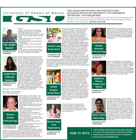 Voting is open to all current GSO members and will occur April 18 through April 25, 2011. You may vote through your MyUH account. The candidates and their platforms are listed below. gso@hawaii.edu