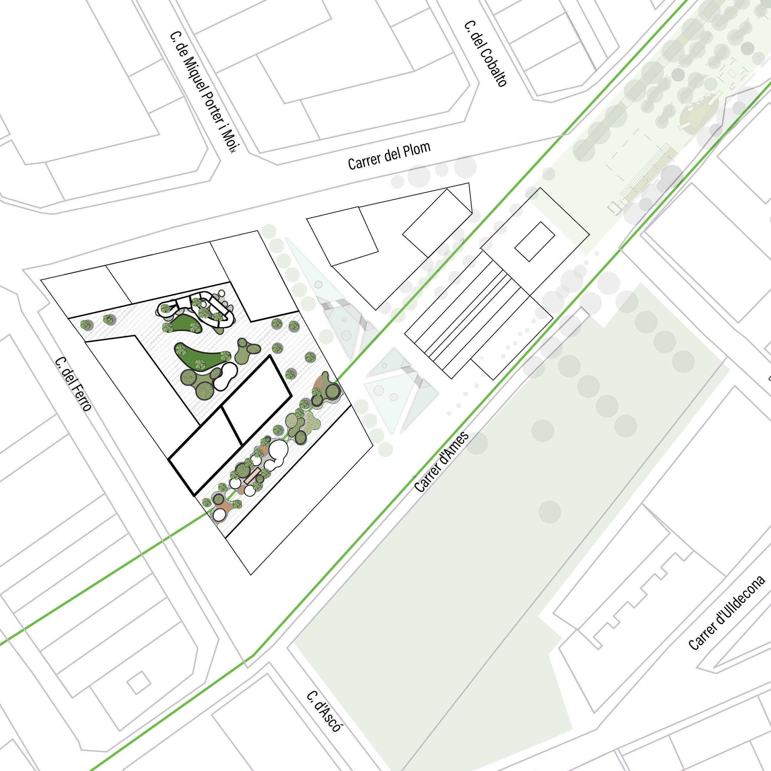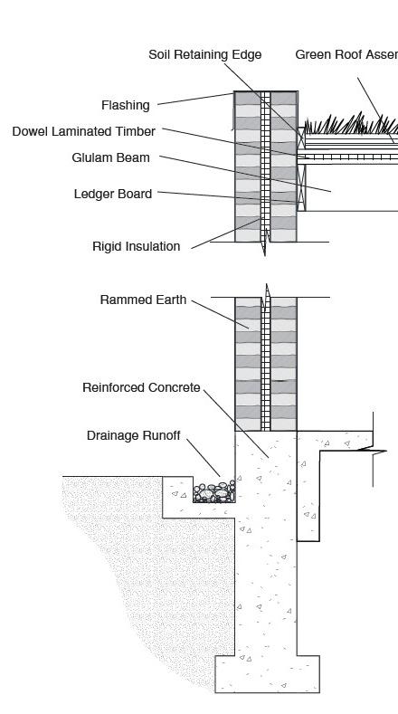 Sustainability is at the core of the architectural strategy, incorporating rammed earth walls for natural temperature regulation, cork insulation for its renewable and excellent thermal properties, and green roofs to reduce runoff and improve insulation.