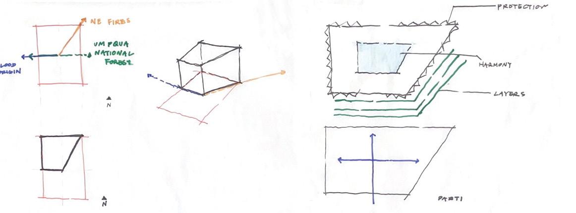 The Resilient Center in Roseburg, Oregon, is a community refuge and learning hub designed to withstand wildfires and other climate challenges including floods, extreme heat, and drought. Situated in an area prone to wildfires originating from the northwest, the center serves as both a refuge and a learning hub, embodying a dual mission: to provide immediate support to individuals and families affected by wildfires and to educate the community on comprehensive disaster preparedness and mitigation. The facility was designed using the three concept words: layers, harmony, and protection.