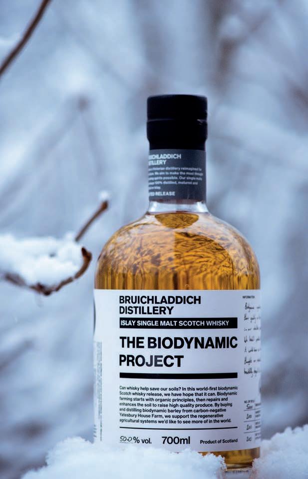 Und dann gibt es noch zwei Leuchtturmprojekte. Das eine ist Bruichladdich auf der Insel Islay. 2003 kam dort der erste Whisky aus der Brennerei. „Anns an t-seann Doigh“ nannten ihn die Laddies. Was Gälisch ist und auf Deutsch so viel heißt wie „Auf die alte Art“. Immerhin wurden etwa 15.000 Flaschen dieser Abfüllung auf den Markt gebracht. Ein grundsolider Single Malt, sehr wohl herkunftstypisch, aber nichts Großes. Allerdings waren für Bruichladdich damit die Weichen gestellt. Mit dem Organic 2009 kam das nächste Produkt auf den Markt und dann, ein paar Jahre später, ließ die Destillerie „The Biodynamic Project“ vom Stapel. Damit waren auf den Labels der Whiskys nicht nur das EU-Bio-Logo, sondern auch jenes von Demeter zu sehen. Biodyn ist beim Schnaps angekommen. Und damit auch Begriffe wie Bodengesundheit, regenerative Landwirtschaft oder CO2-Neutralität. Auch sensorisch sind diese Whiskys deutlich mehr als Durchschnitt. Sie zeigen Komplexität, Substanz, Tiefgang und klare Herkunft. Die biodynamisch angebaute Gerste kommt von der Yatesbury House Farm.