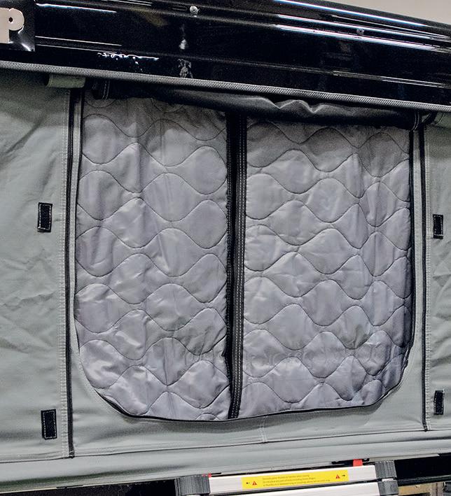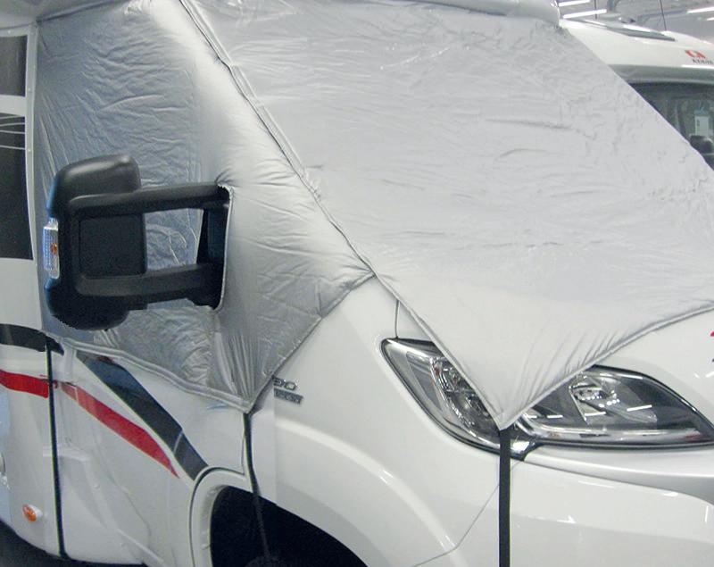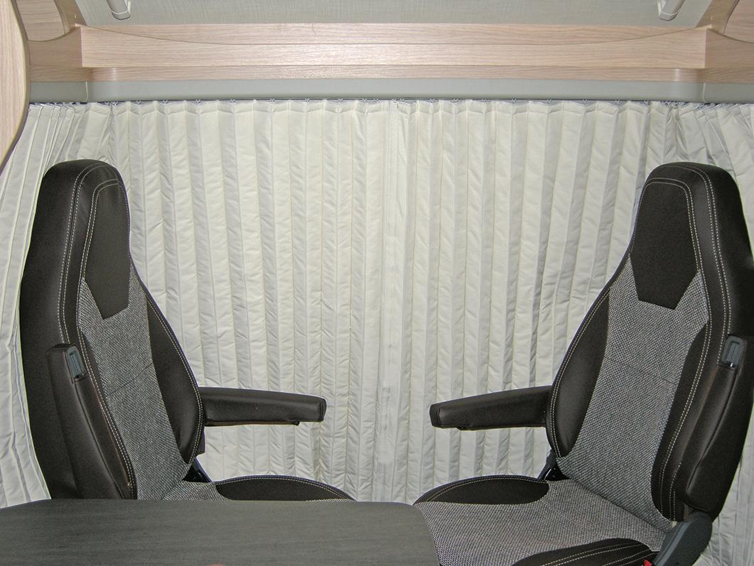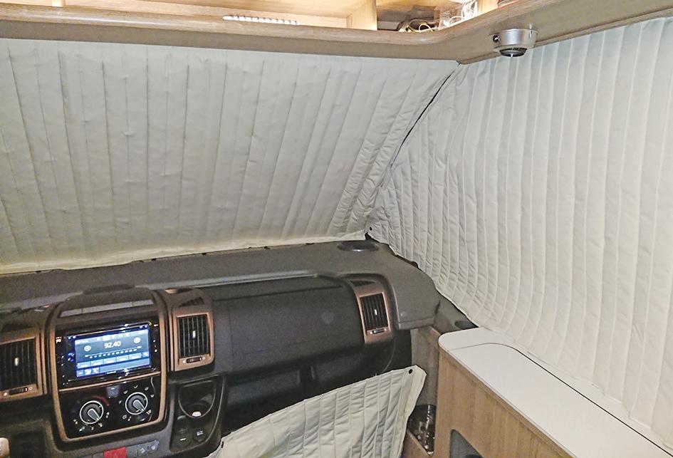 GoCamp thermal curtain for semi-integrated motorhomes is hung around the cab and consists of three different materials which together protect against cold, heat, sound and light. The bright textile on the inside is of high quality and in combination with the pleating, it is sound-absorbing which creates a homely indoor environment. The thermal curtain is washable at 40˚C.