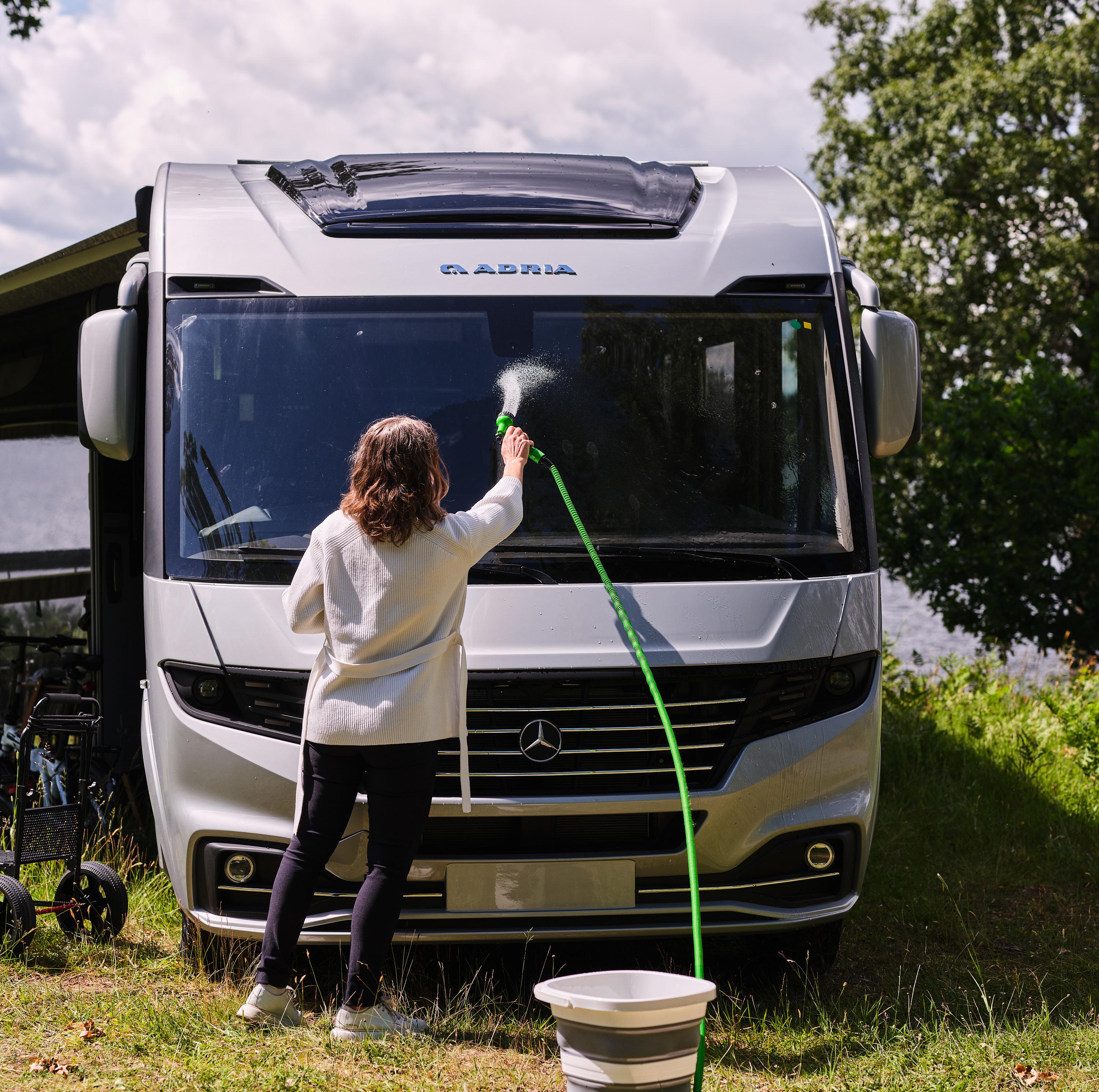 GoCamp thermal curtain for fully integrated motorhomes is mounted in the windows and consists of three different materials which together protect against cold, heat, sound and light. The bright textile on the inside is of high quality and in combination with the pleating, it is sound-absorbing which creates a homely indoor environment. The thermal curtain is washable at 40˚C.