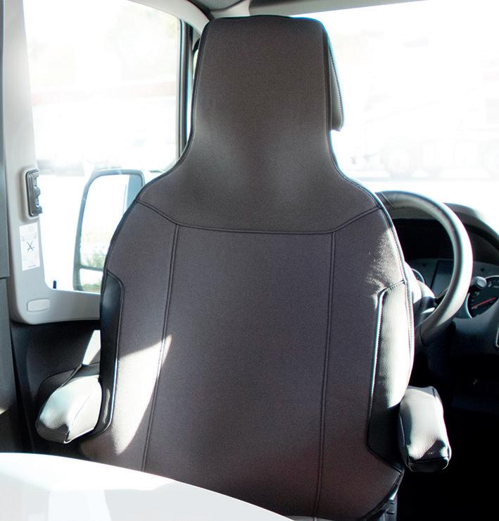 Past op rechter- en linkerstoelen met dijbeensteun in Mercedes Sprinter 2018-. Materiaal: Middenstof van polyester gecombineerd met randen van kunstleer. Wasvoorschrift: Wassen op 30˚C in een mild wasprogramma.