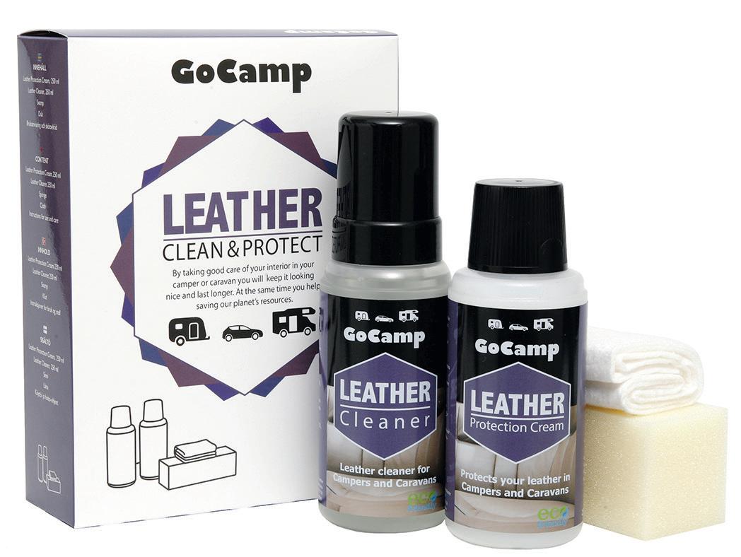 Een compleet camper- en caravanproduct voor regelmatig onderhoud en verzorging van met leer beklede stoelen (niet suède/nubuck). Bevat een leerreiniger (T95-33A) voor het wassen van bekleding en een leercrème (T95-33B) om de bekleding te beschermen tegen vlekken en morsen. Het pakket bevat ook paddenstoelen, kleding- en onderhoudsadvies.
