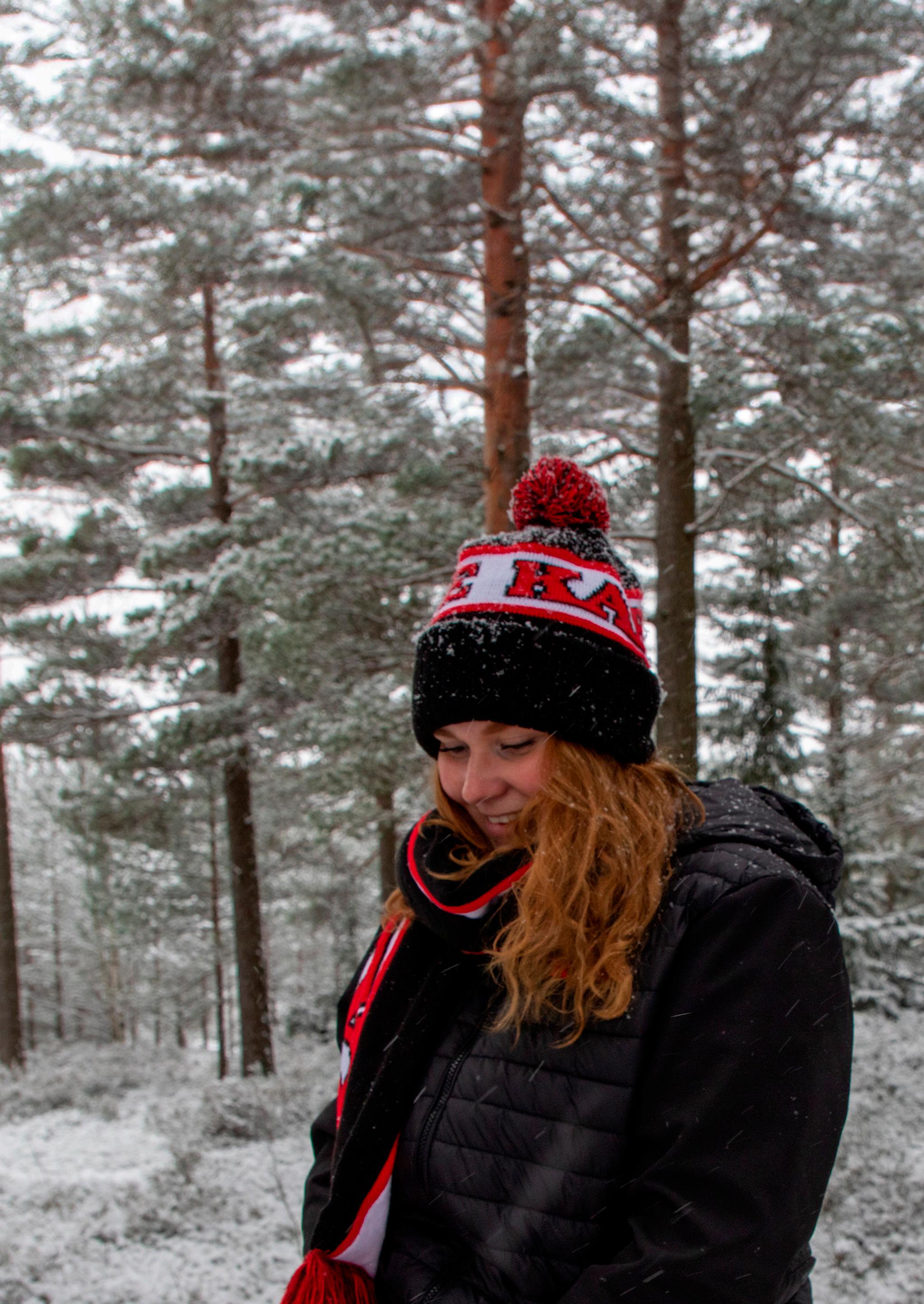 Spezialgefertigter Schal, passend zur Mütze mit eingewebtem Motiv und Lederpatch.