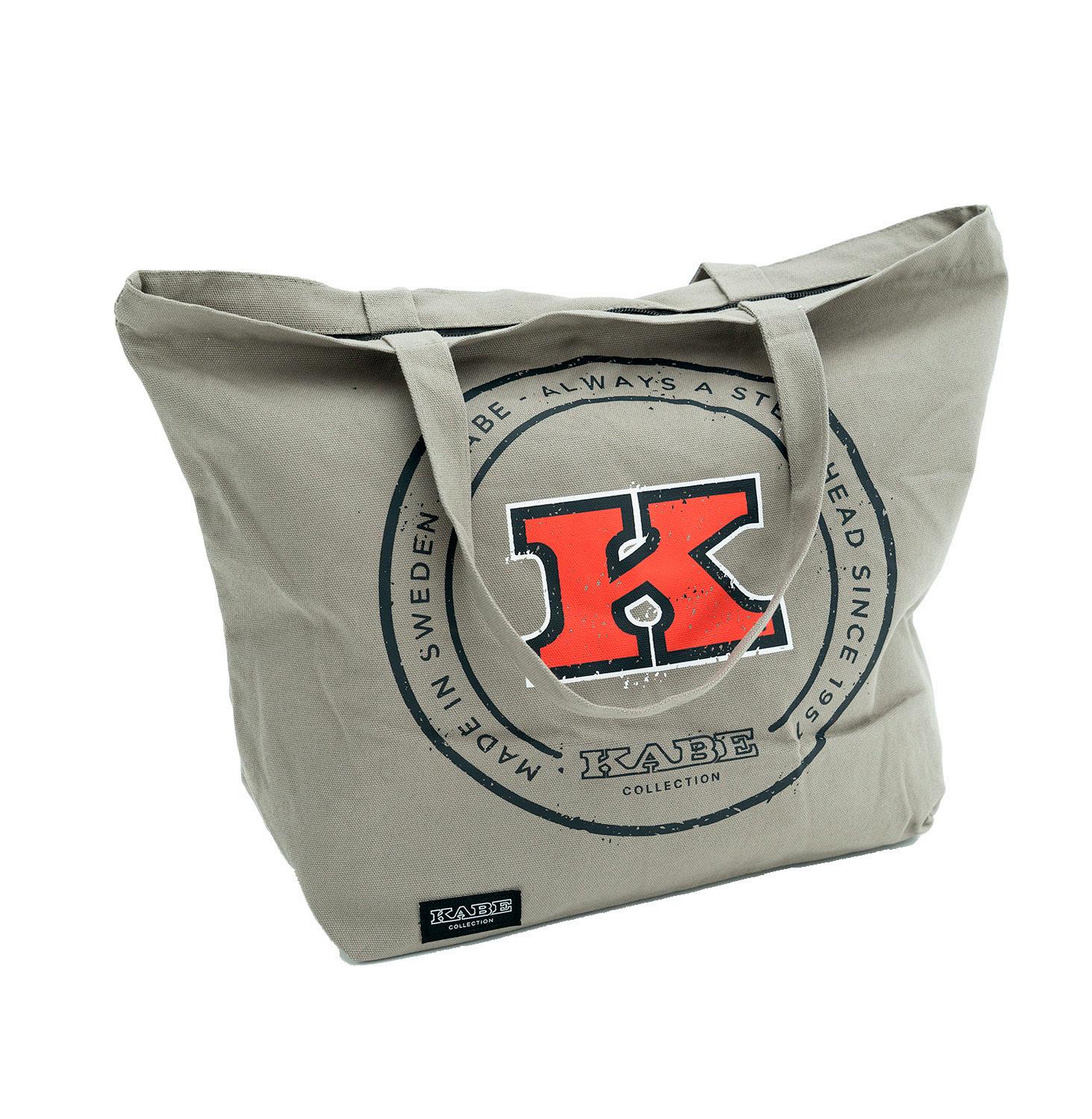 Beiger Sonnenschutz aus Baumwolle mit gesticktem Kabelogo. Beige Strandtasche mit exklusivem Aufdruck des KABE-Logos.